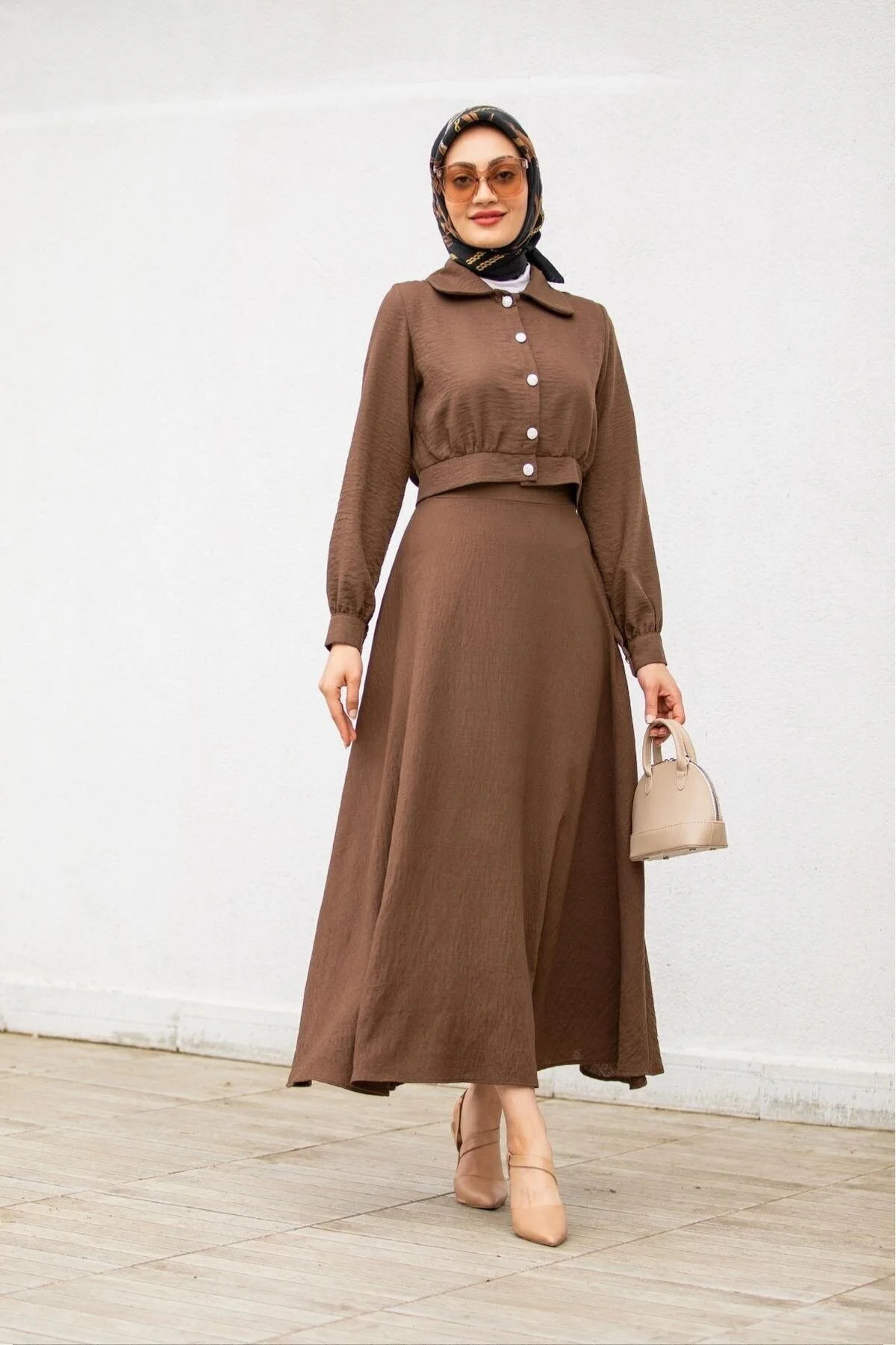 Keten Kumaş Etek Ceket Tesettür Takım- Kahverengi (TD265)