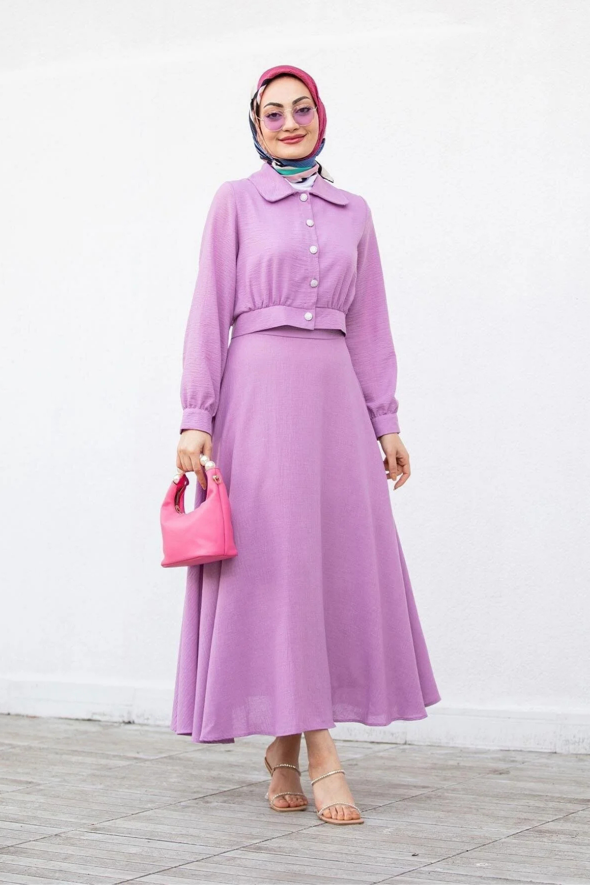Keten Kumaş Etek Ceket Tesettür Takım- Lila (TD265)