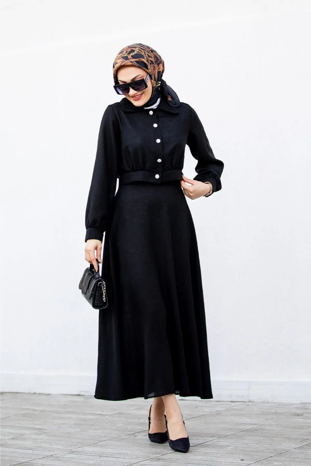 Keten Kumaş Etek Ceket Tesettür Takım- Siyah (TD265)