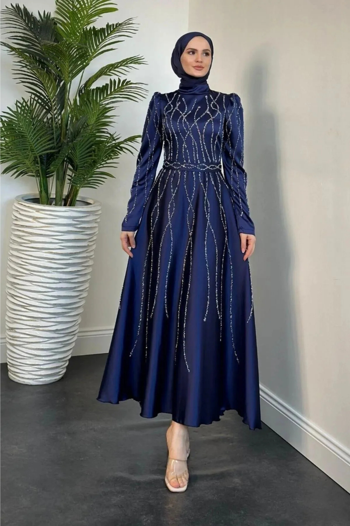 Amaris Taşlı Prenses Kesim Saten Kumaş Tesettür Abiye- Lacivert (TD228)