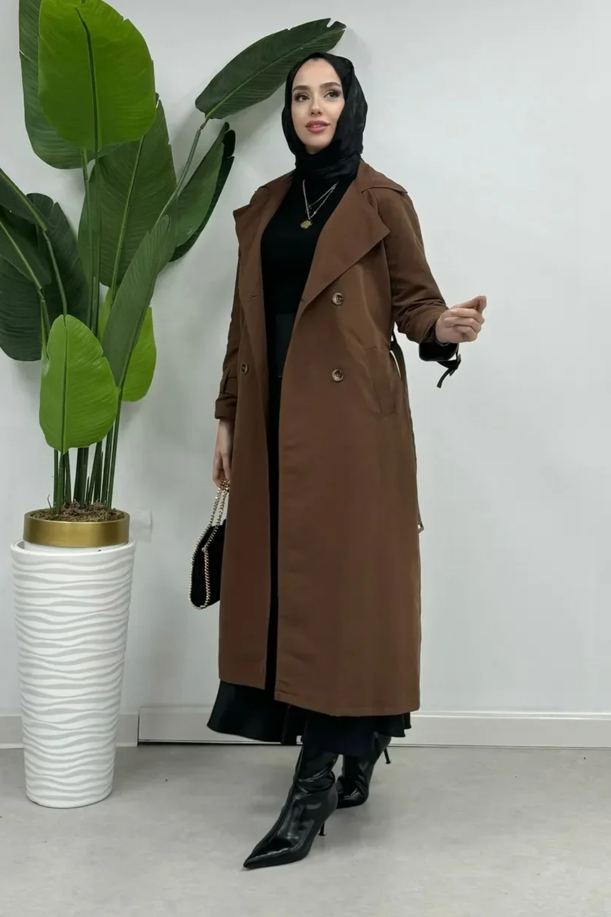 Arka Yırtmaç Detaylı Torino Kumaş Tesettür Trençkot- Kahverengi (TD231)