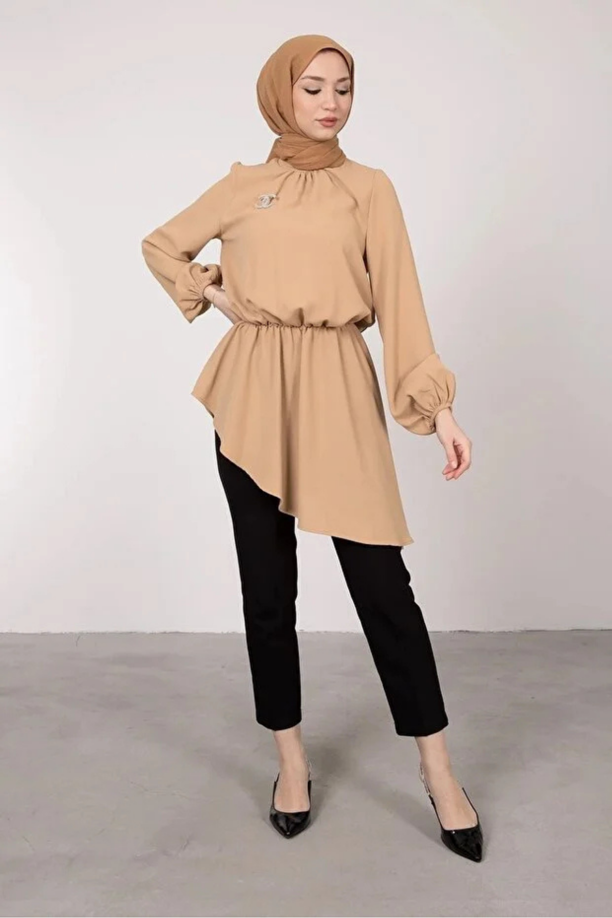 Asimetrik Kesim Balon Kol Tesettür Tunik- Vizon (TD253)