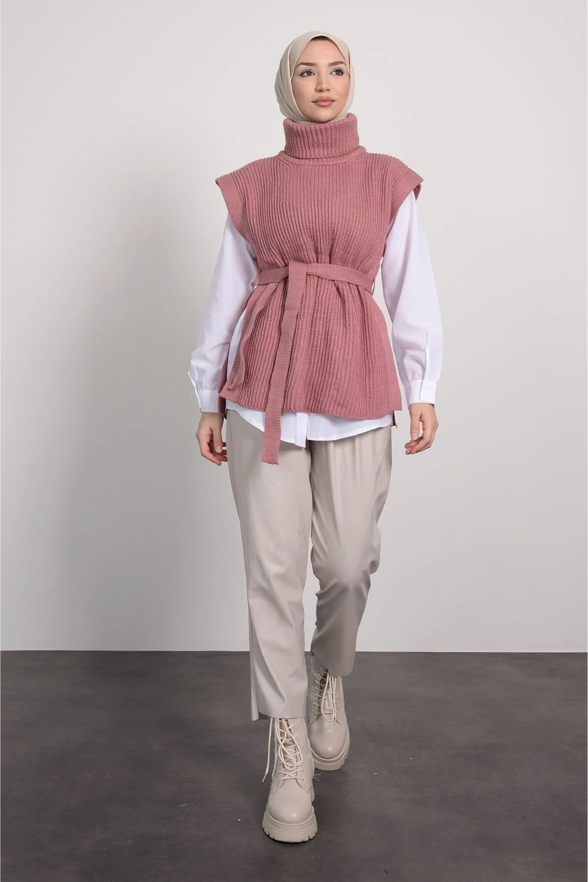 Balıkçı Yaka Kemer Detaylı Tesettür Süveter- Pembe Standart (36-42 Uyumlu)