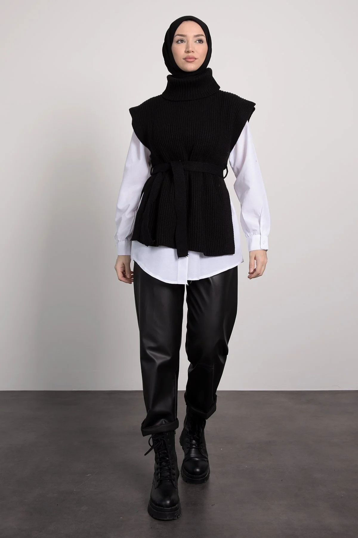 Balıkçı Yaka Kemer Detaylı Tesettür Süveter- Siyah Standart (36-42 Uyumlu) (TD275)