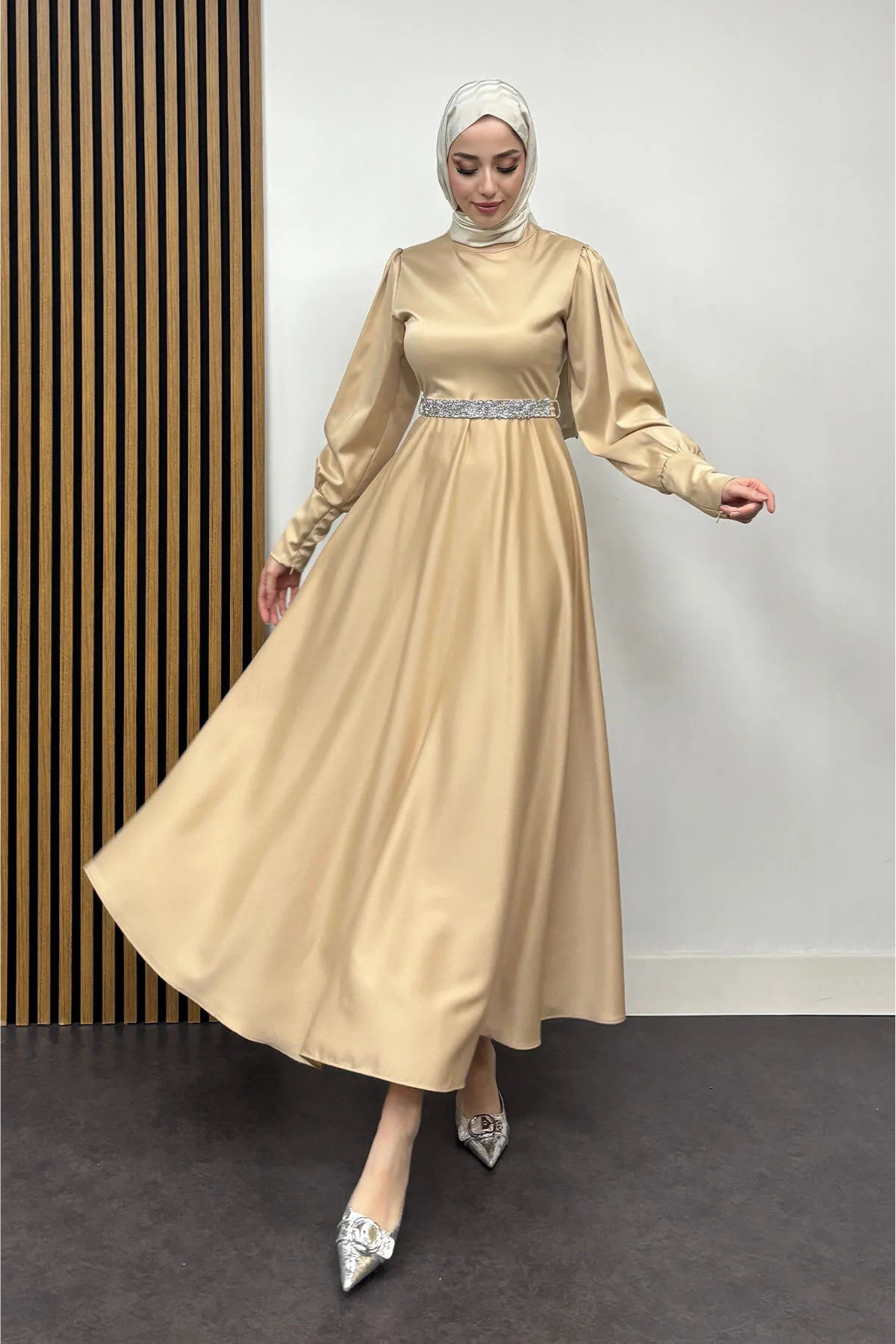 Bel Taş Detaylı Kolu Manşetli Abiye- Bej (TD287)