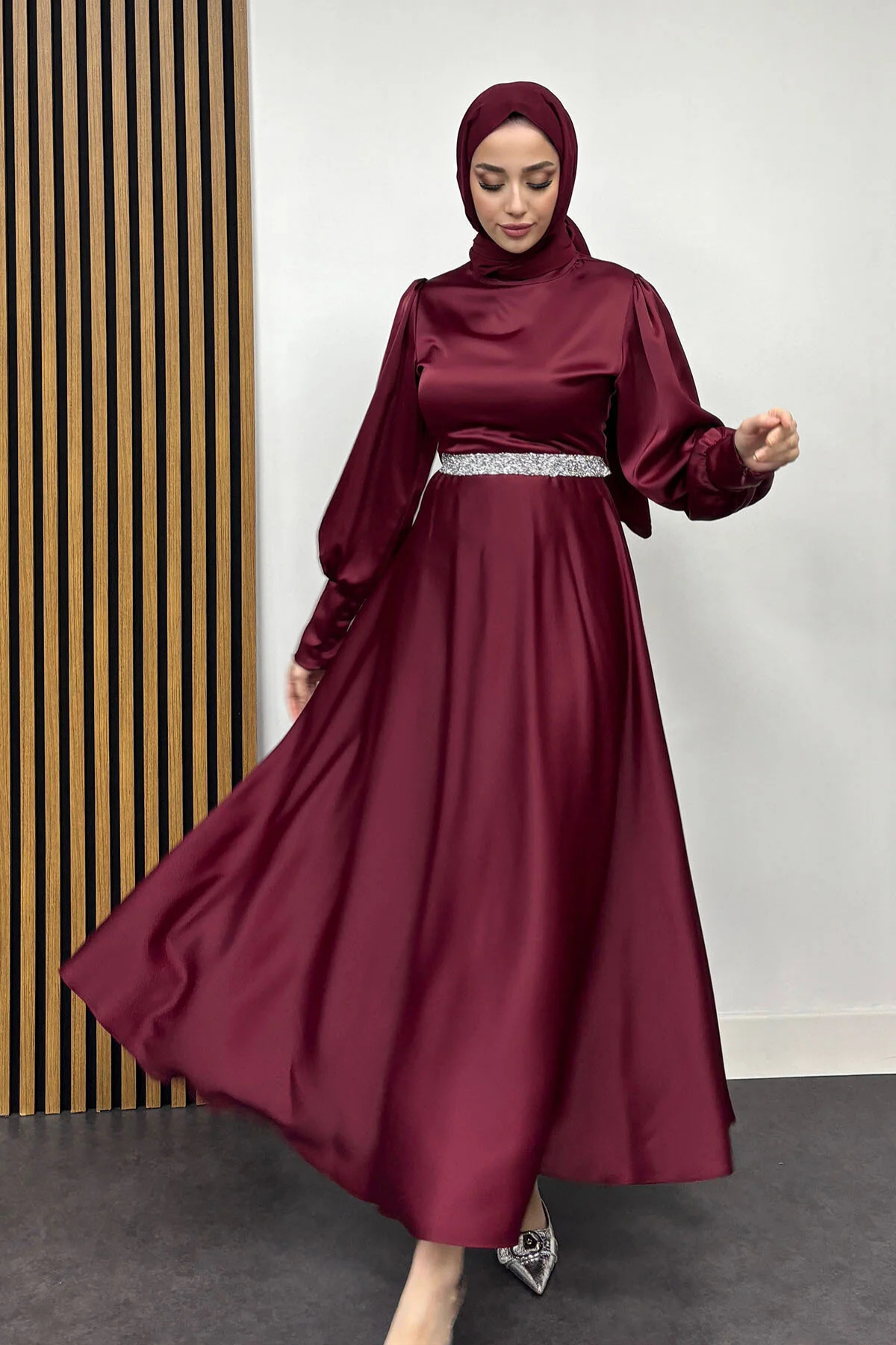 Bel Taş Detaylı Kolu Manşetli Abiye- Bordo Bel Taş Detaylı Kolu Manşetli Abiye- Zümrüt Bel Taş Detaylı Kolu Manşetli Abiye- Bej