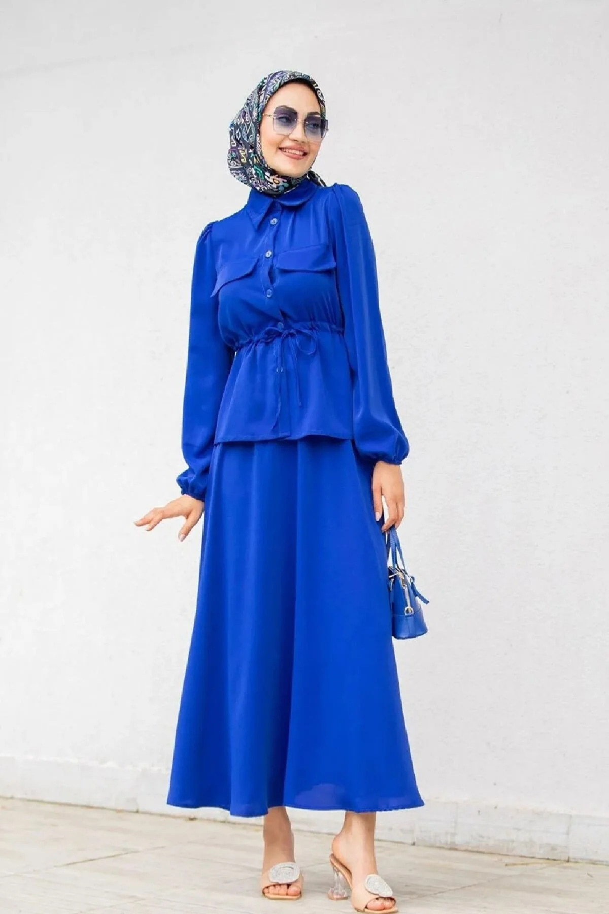 Belden Bağcıklı Etekli Sare Tesettür Takım- Saks Mavi