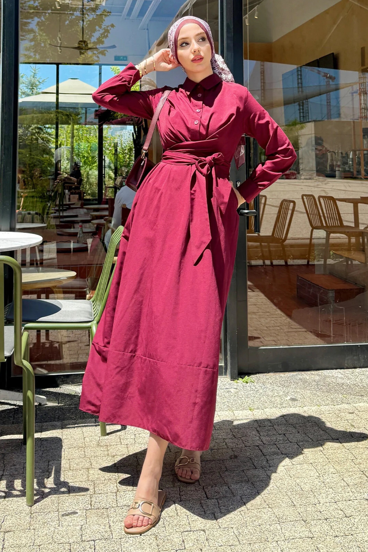 Belden Bağlamalı Tesettür Elbise-Bordo (CRN69)