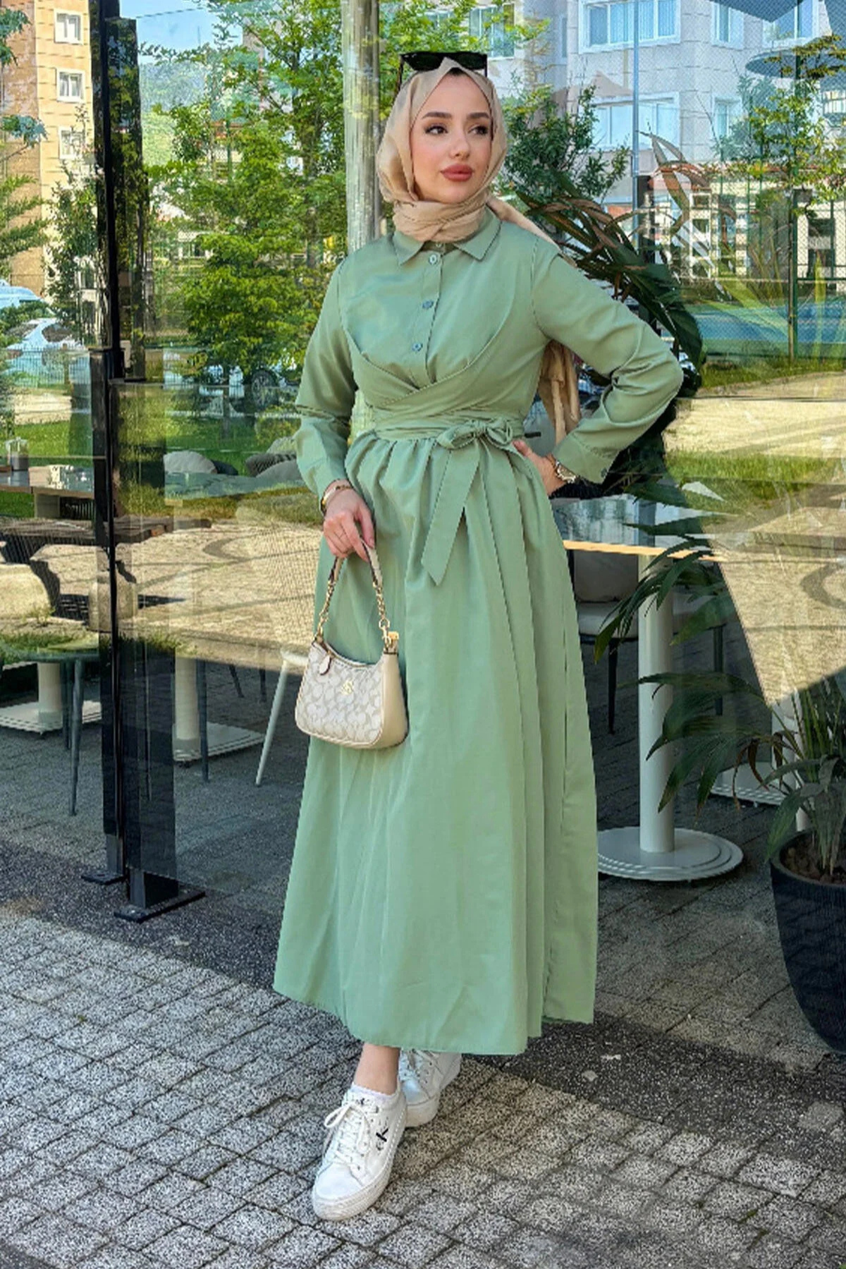Belden Bağlamalı Tesettür Elbise-Çağla Yeşili