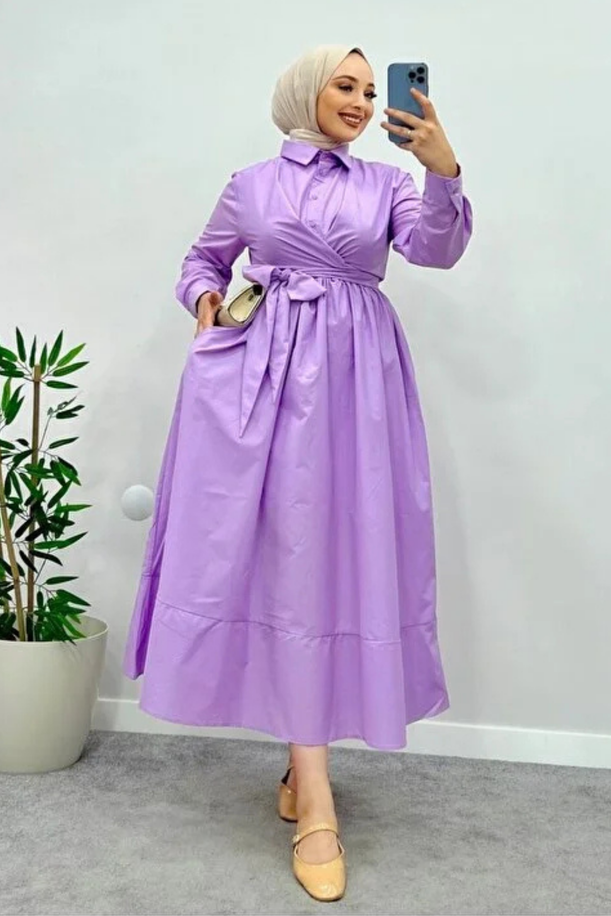Belden Bağlamalı Tesettür Elbise-Lila
