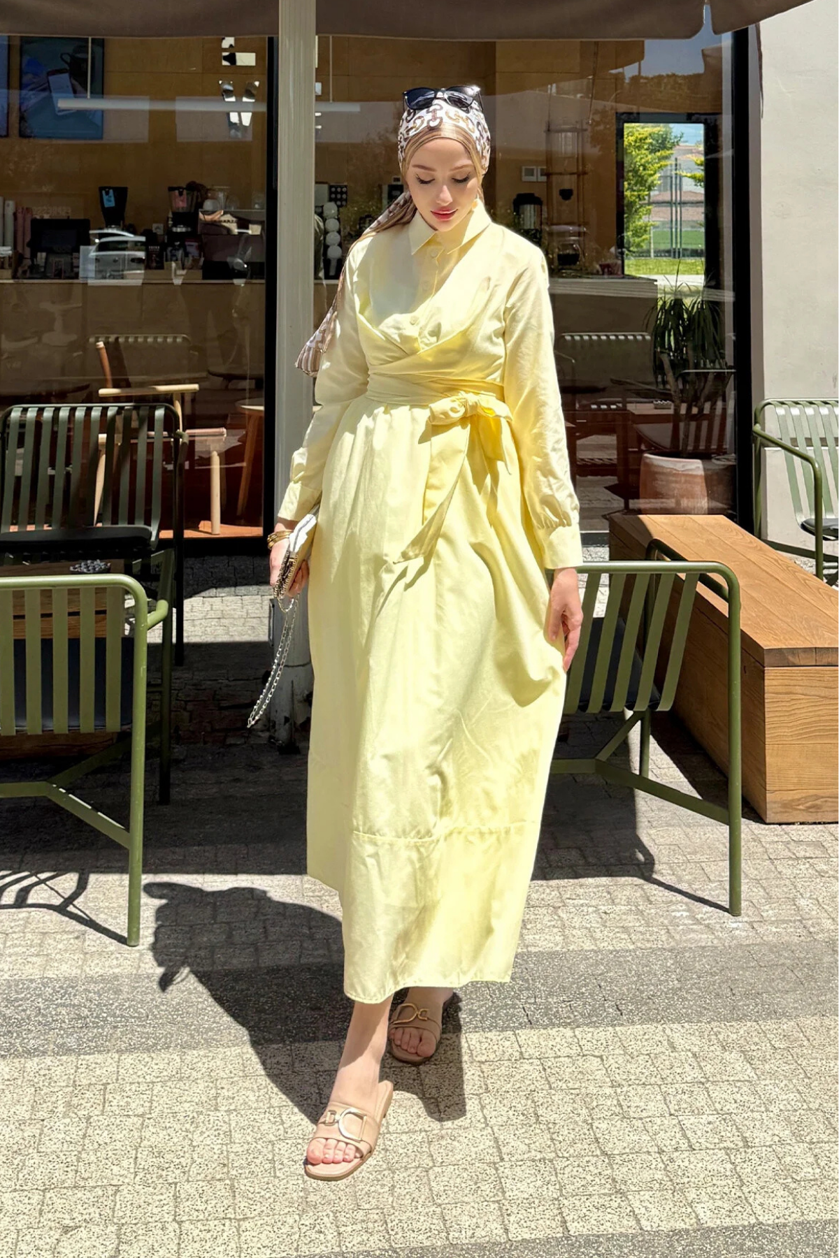 Belden Bağlamalı Tesettür Elbise-Sarı (CRN69)