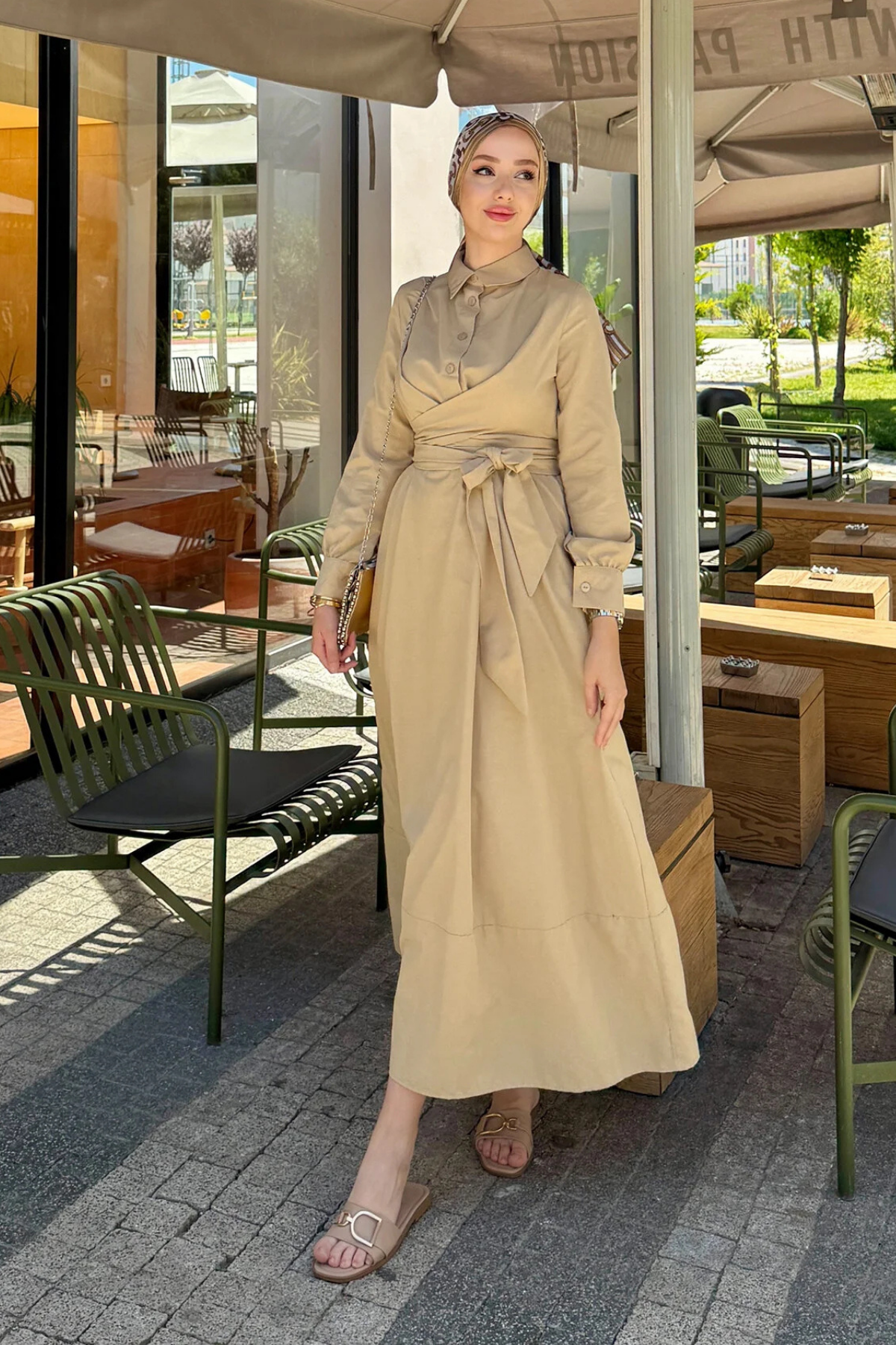 Belden Bağlamalı Tesettür Elbise-Vizon