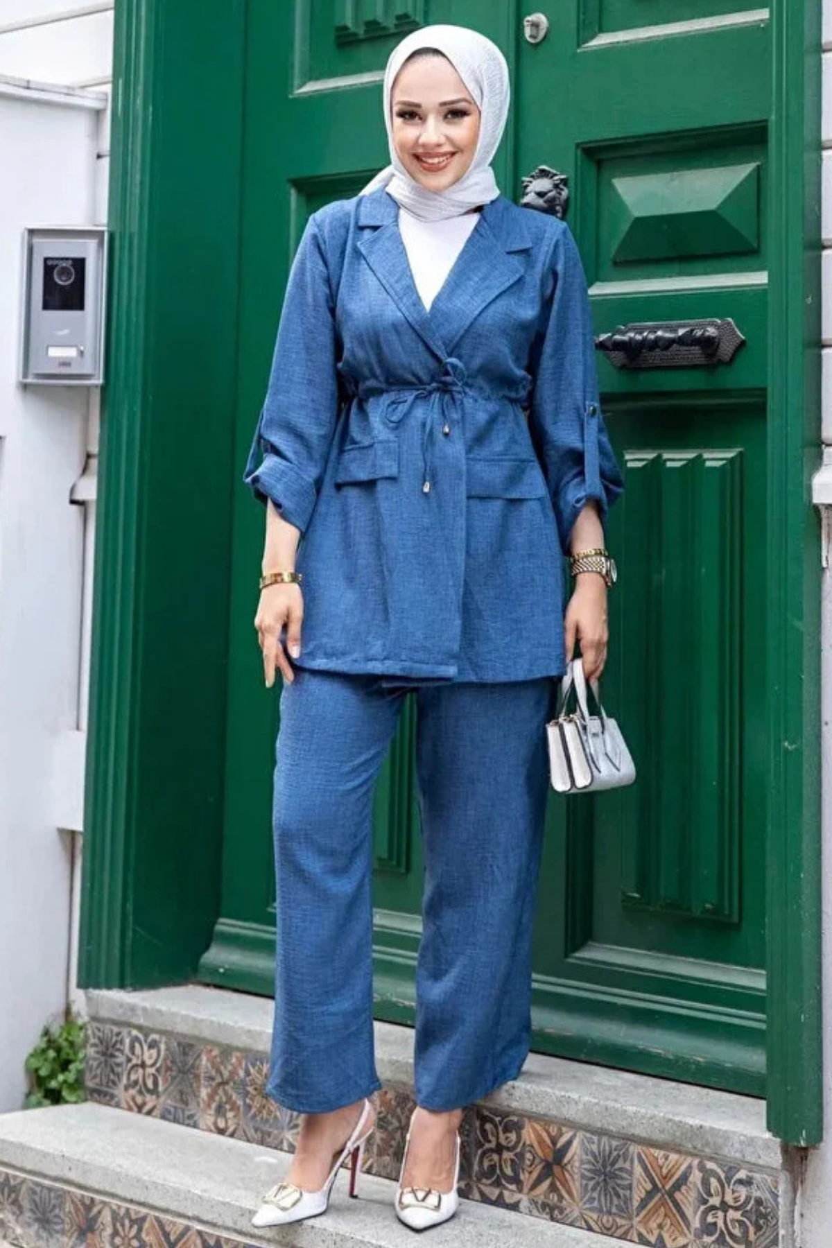 Beli Bağlamalı Ceket ve Pantolon Yazlık Keten Takım- İndigo (TD247)