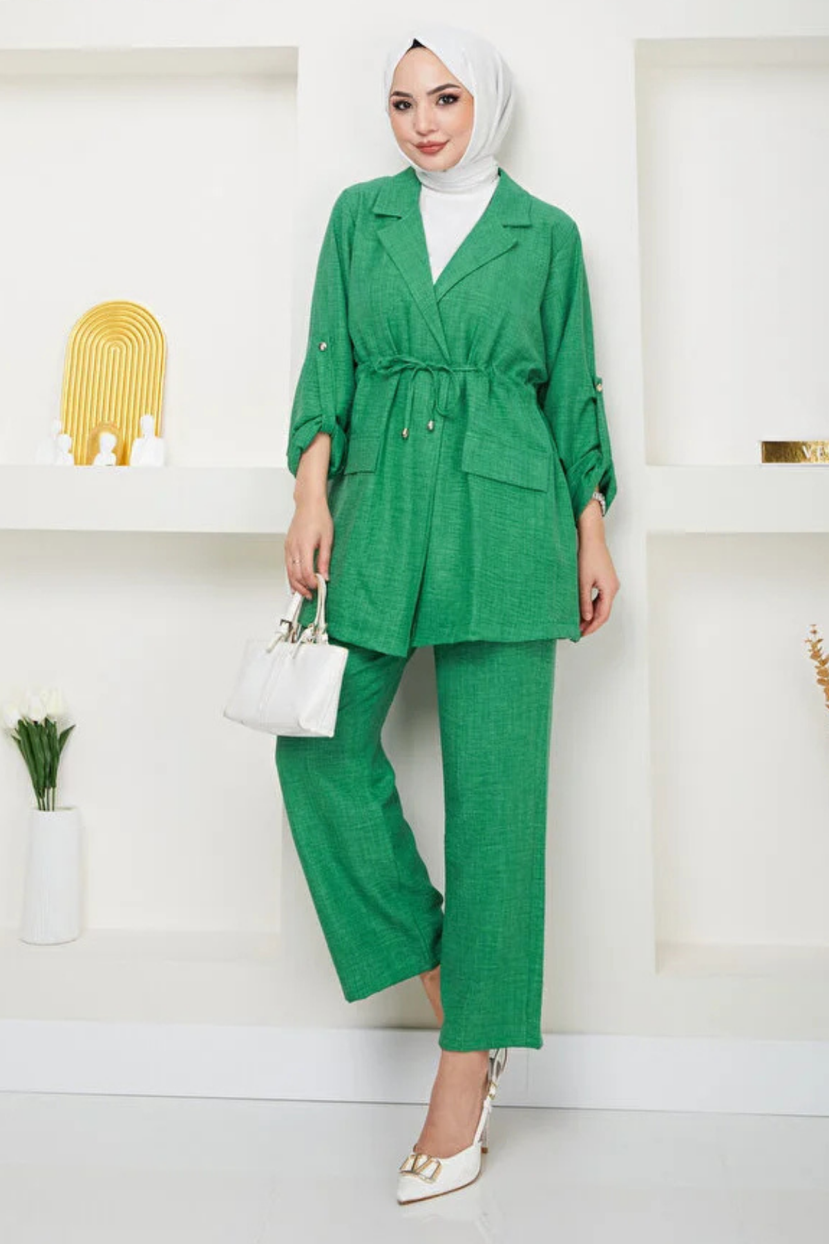 Beli Bağlamalı Ceket ve Pantolon Yazlık Keten Takım- Yeşil (TD247)