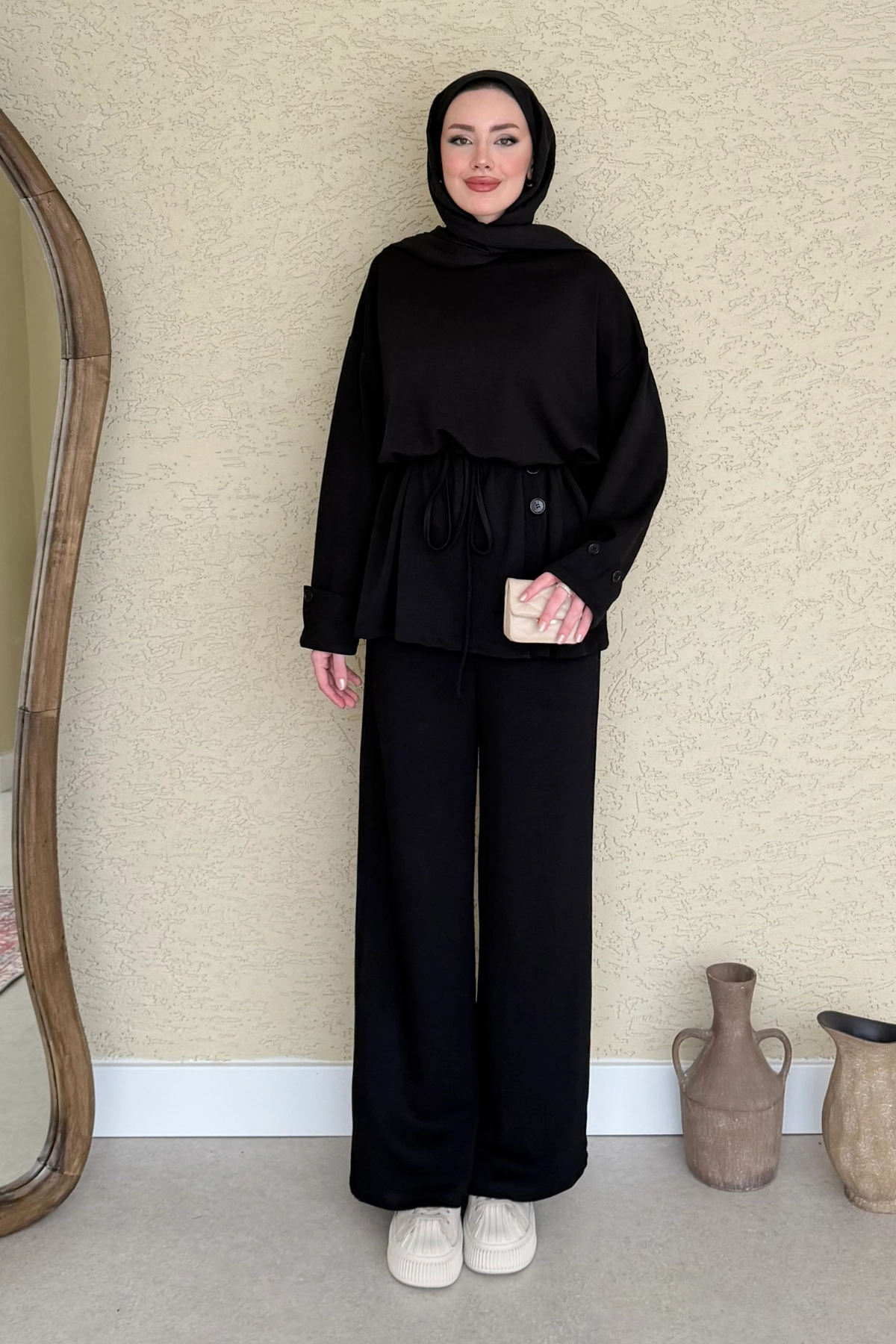 Berla Model Orijinal Oysho Düğmeli Alt Üst Tesettür Takım- Siyah (TD222)
