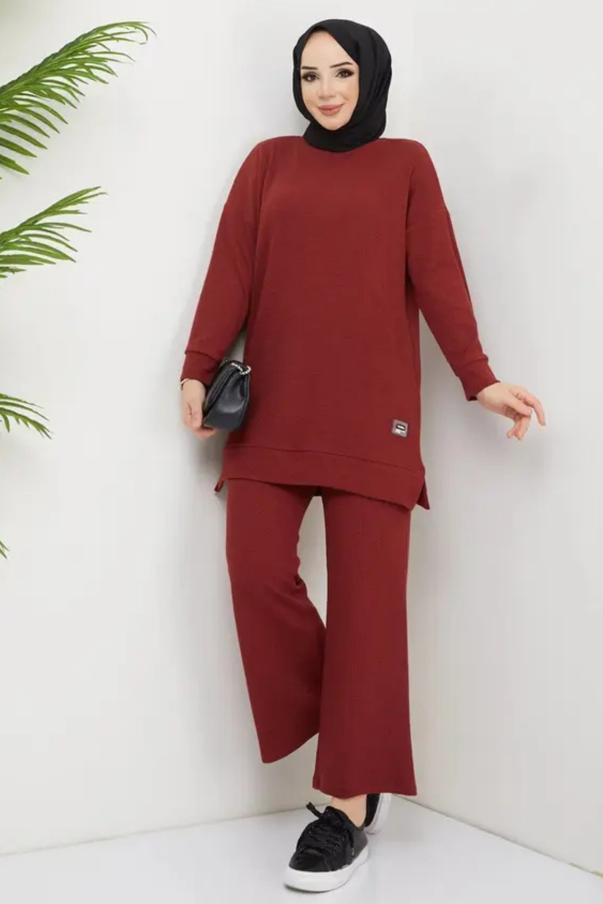 Bol Kesim Tuniği Bisiklet Yaka Alt Üst Tesettür Takım- Bordo (TD219)