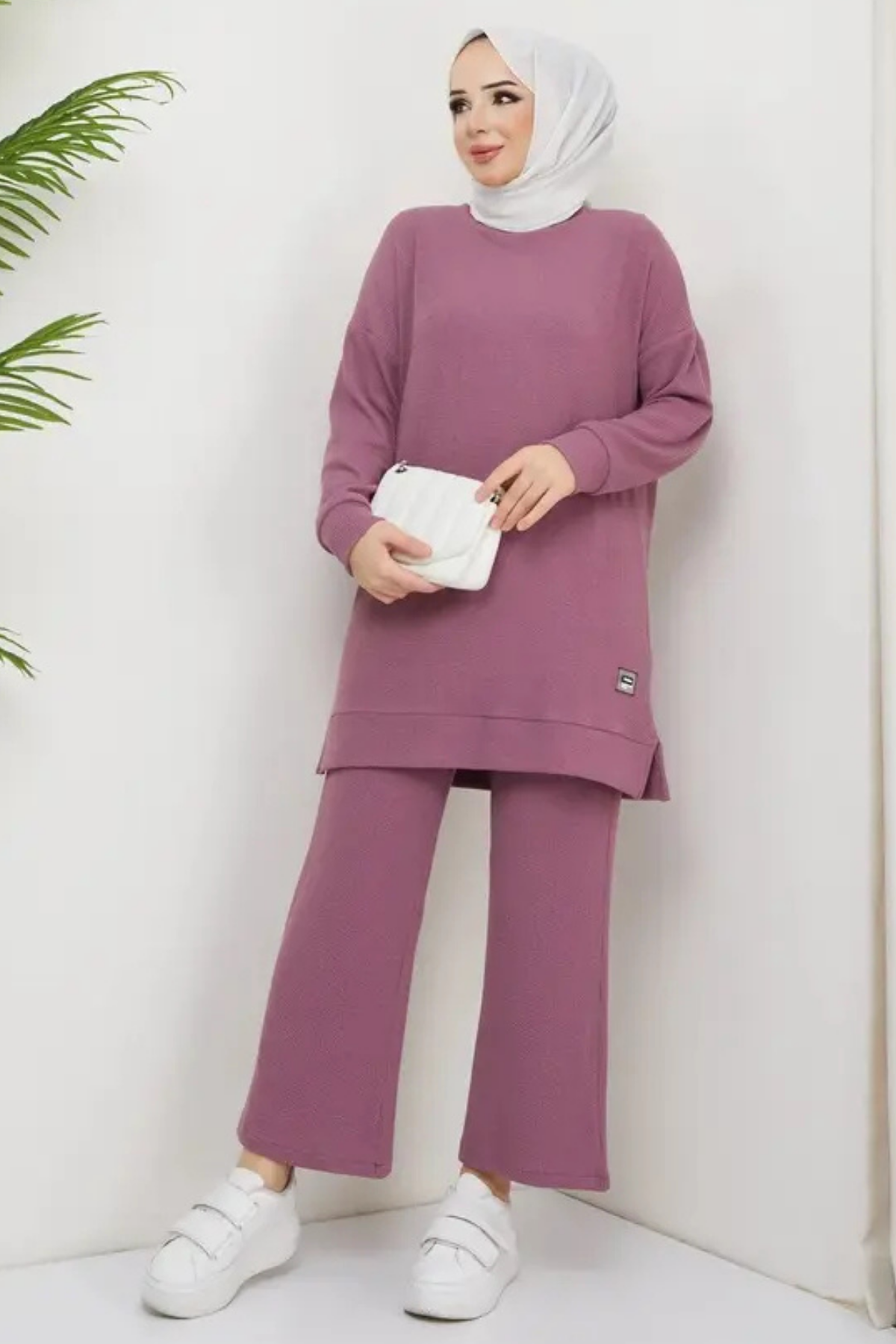 Bol Kesim Tuniği Bisiklet Yaka Alt Üst Tesettür Takım- Gül Kurusu