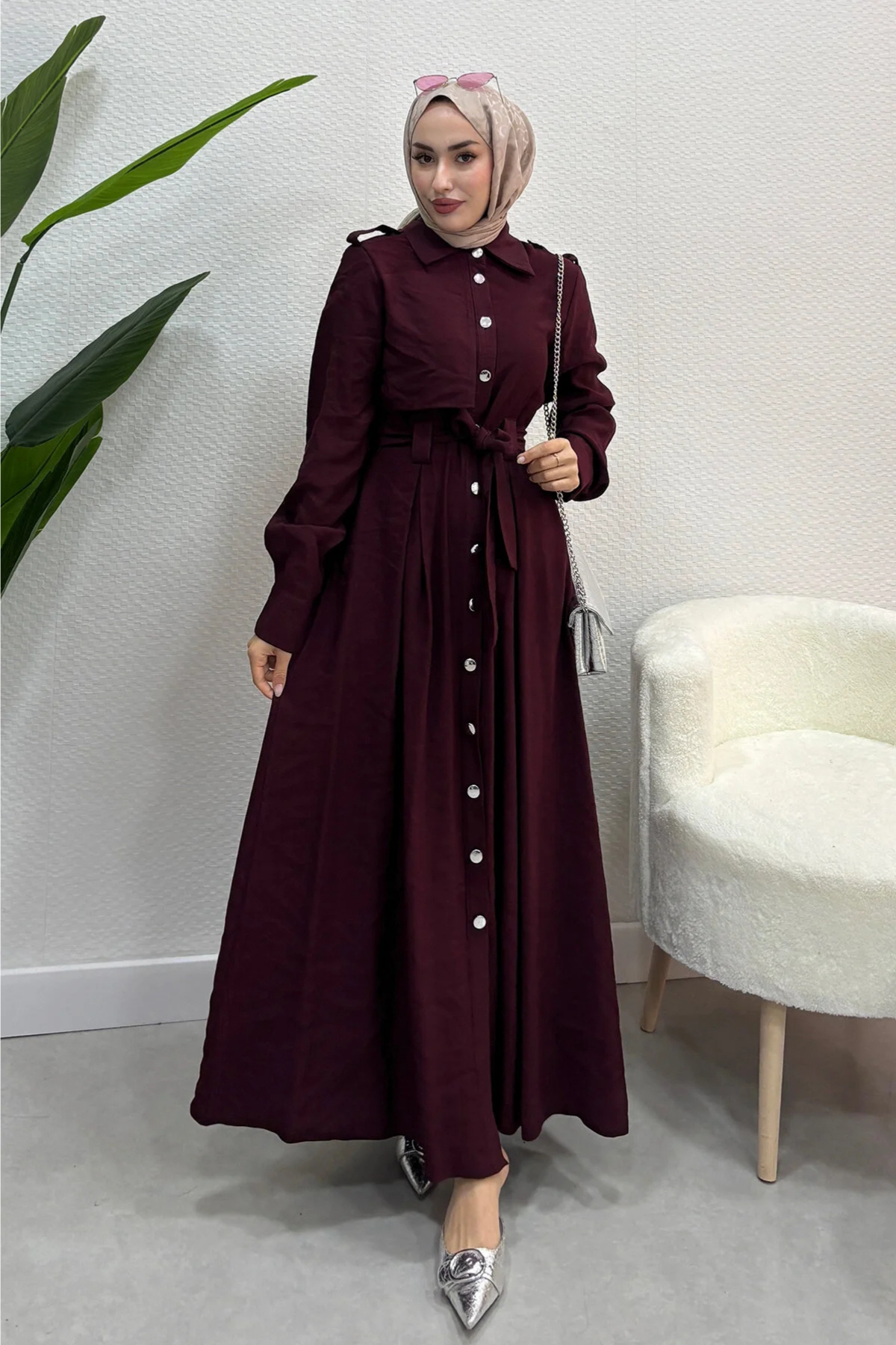 Boydan Düğmeli Tril Tril Yazlık Kumaş Tesettür Elbise- Bordo (TD252)
