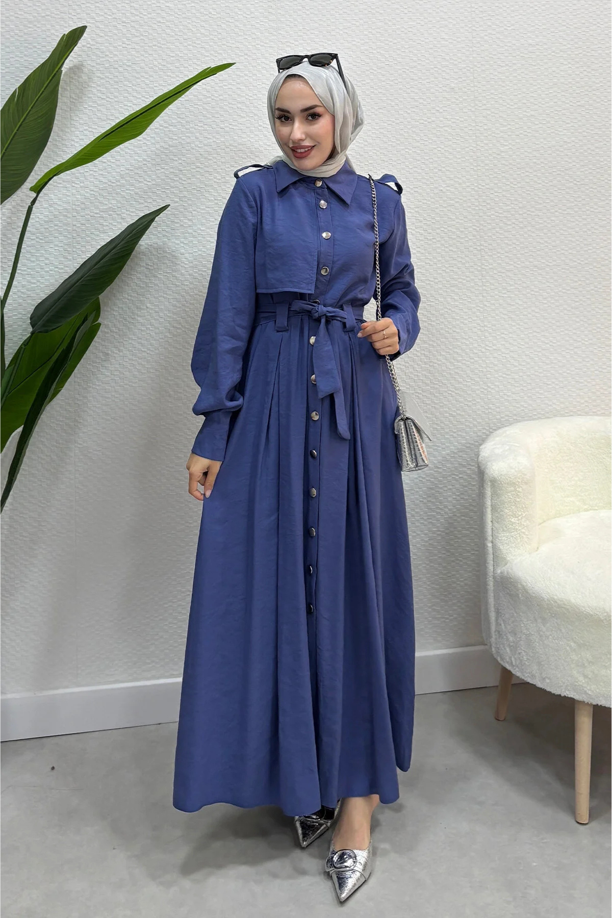 Boydan Düğmeli Tril Tril Yazlık Kumaş Tesettür Elbise- İndigo (TD252)