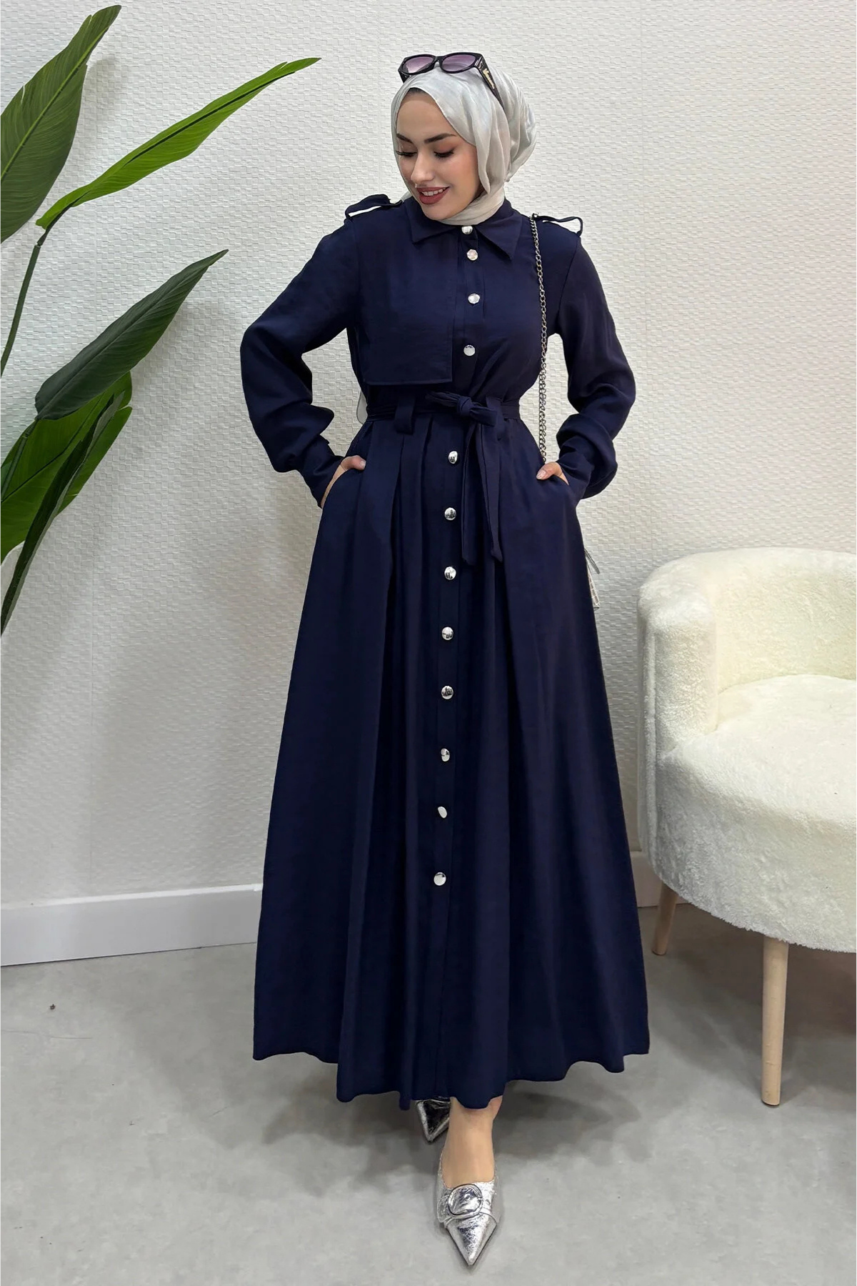 Boydan Düğmeli Tril Tril Yazlık Kumaş Tesettür Elbise- Lacivert (TD252)