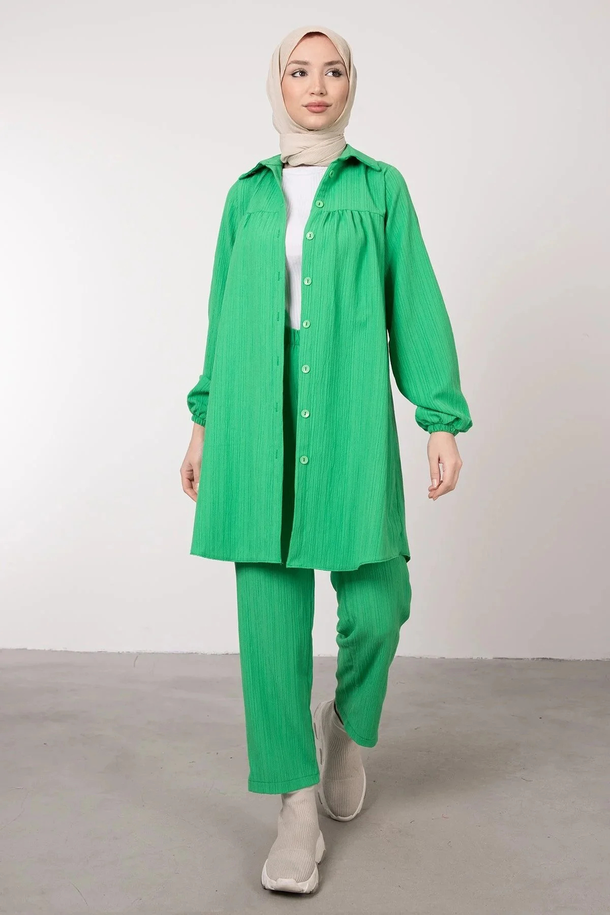 Büzgülü Dikim Gömlek Pantolon Tesettür Takım- Çim Yeşili