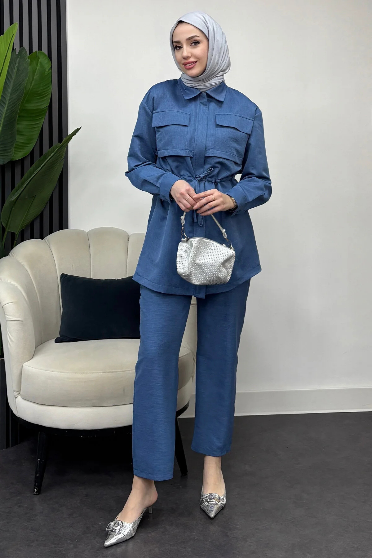 Çift Cepli Fermuarlı Keten İkili Tesettür Takım- İndigo