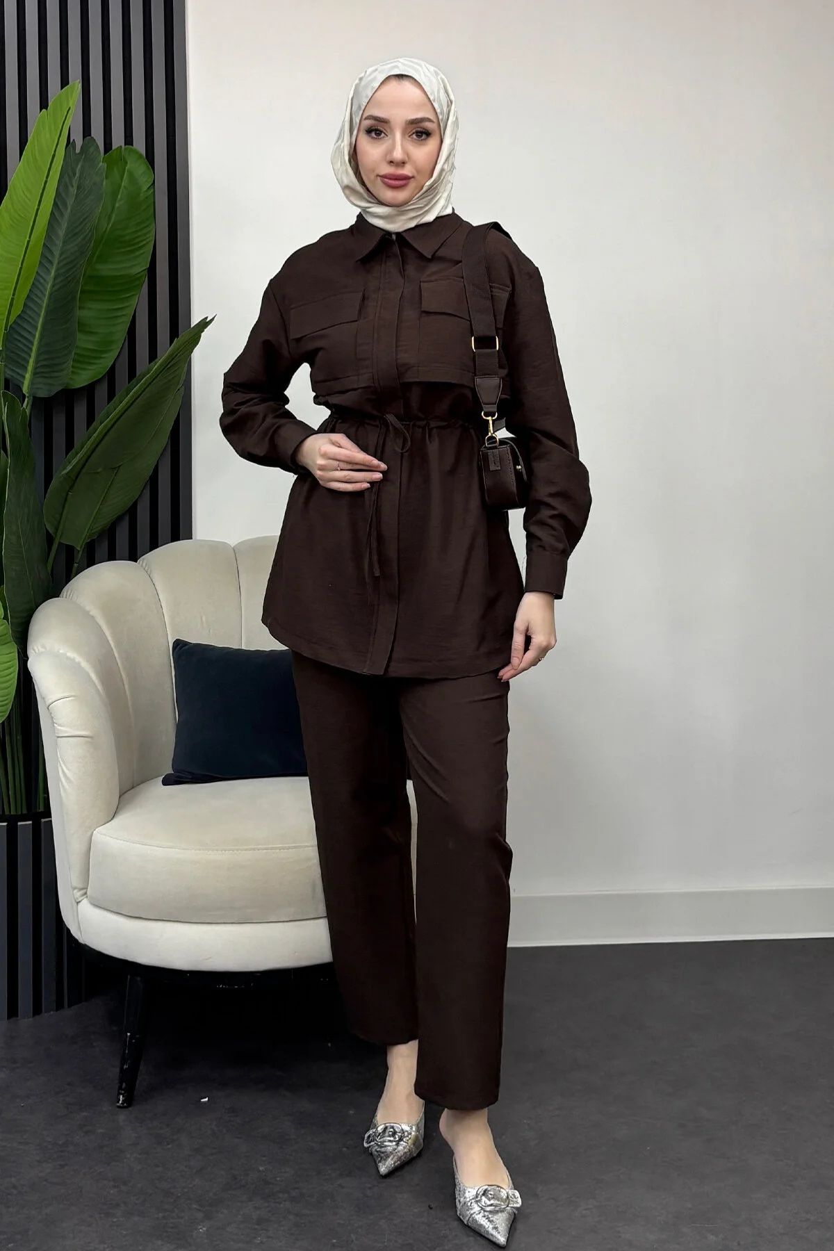 Çift Cepli Fermuarlı Keten İkili Tesettür Takım- Kahverengi (TD251)