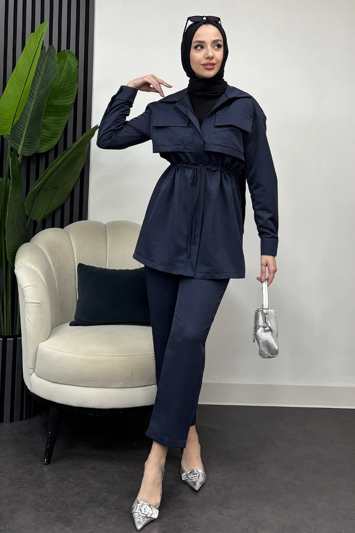 Çift Cepli Fermuarlı Keten İkili Tesettür Takım- Lacivert