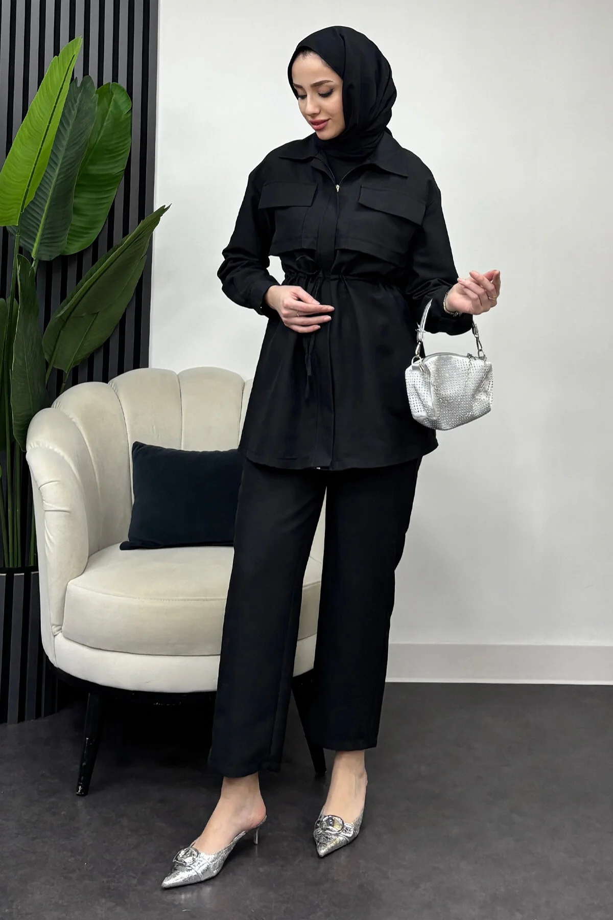 Çift Cepli Fermuarlı Keten İkili Tesettür Takım- Siyah