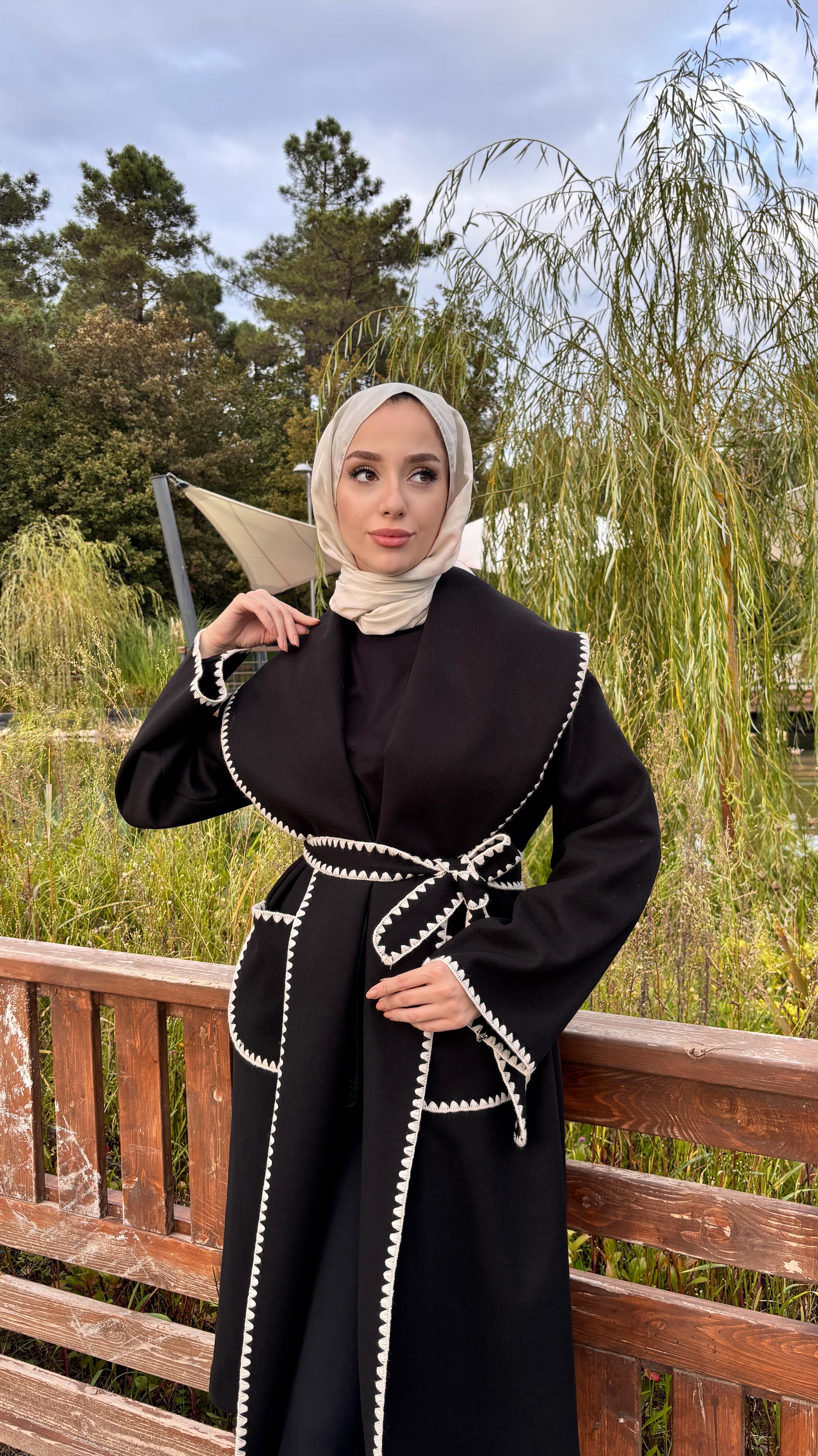 Çoban Dikiş Detaylı Kuşaklı Kaban- Siyah (ARN001)