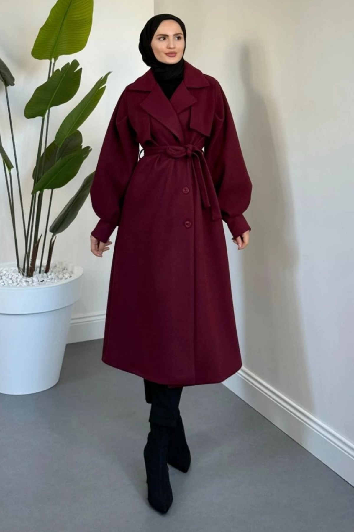 Danisa Cepkenli Astarlı Balon Kol Tesettür Kaban- Bordo