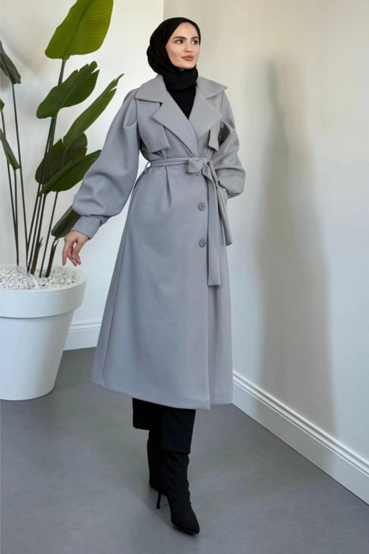 Danisa Cepkenli Astarlı Balon Kol Tesettür Kaban- Gri