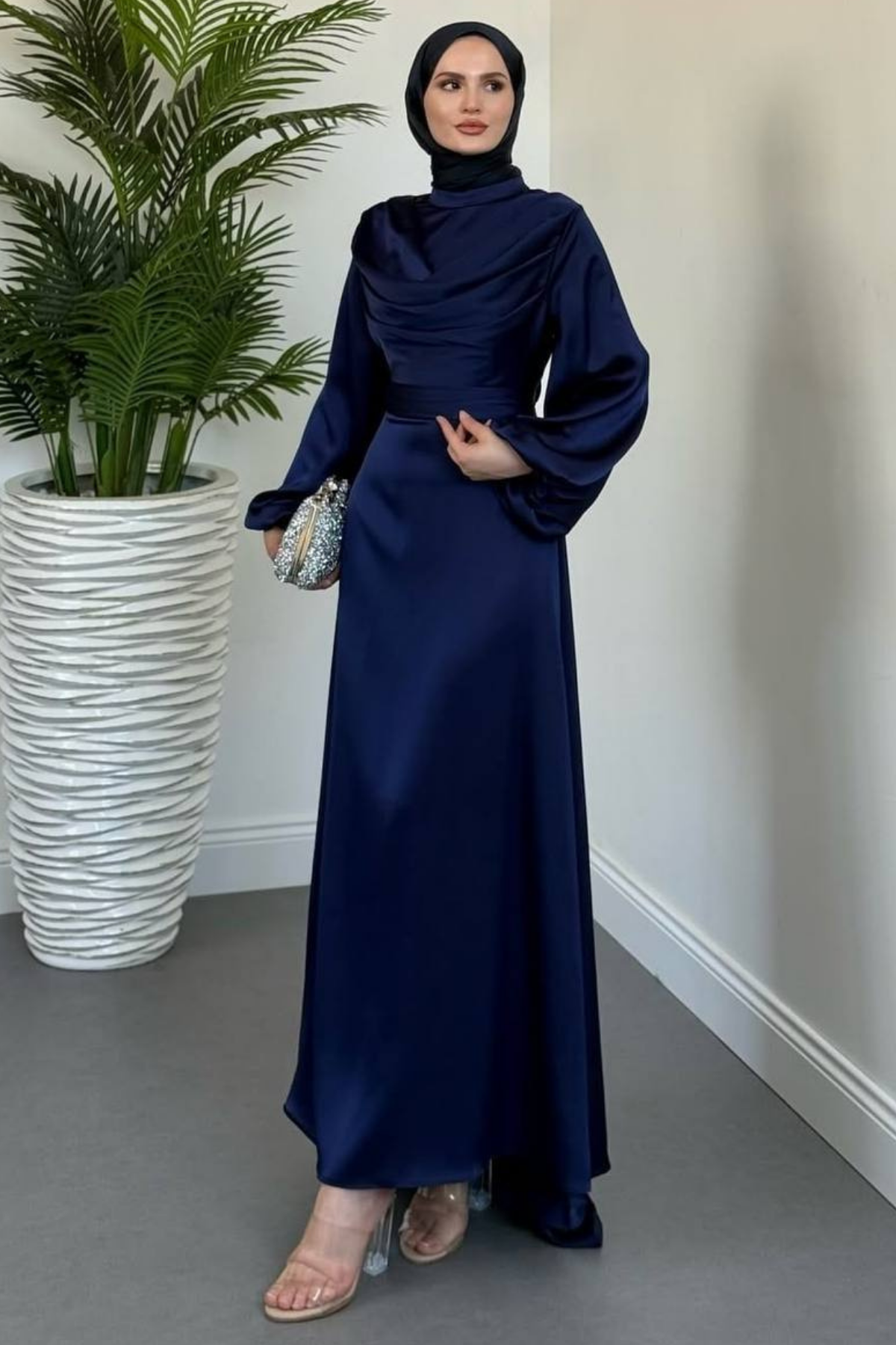Degaje Yaka Kuyruklu Saten Abiye- Lacivert