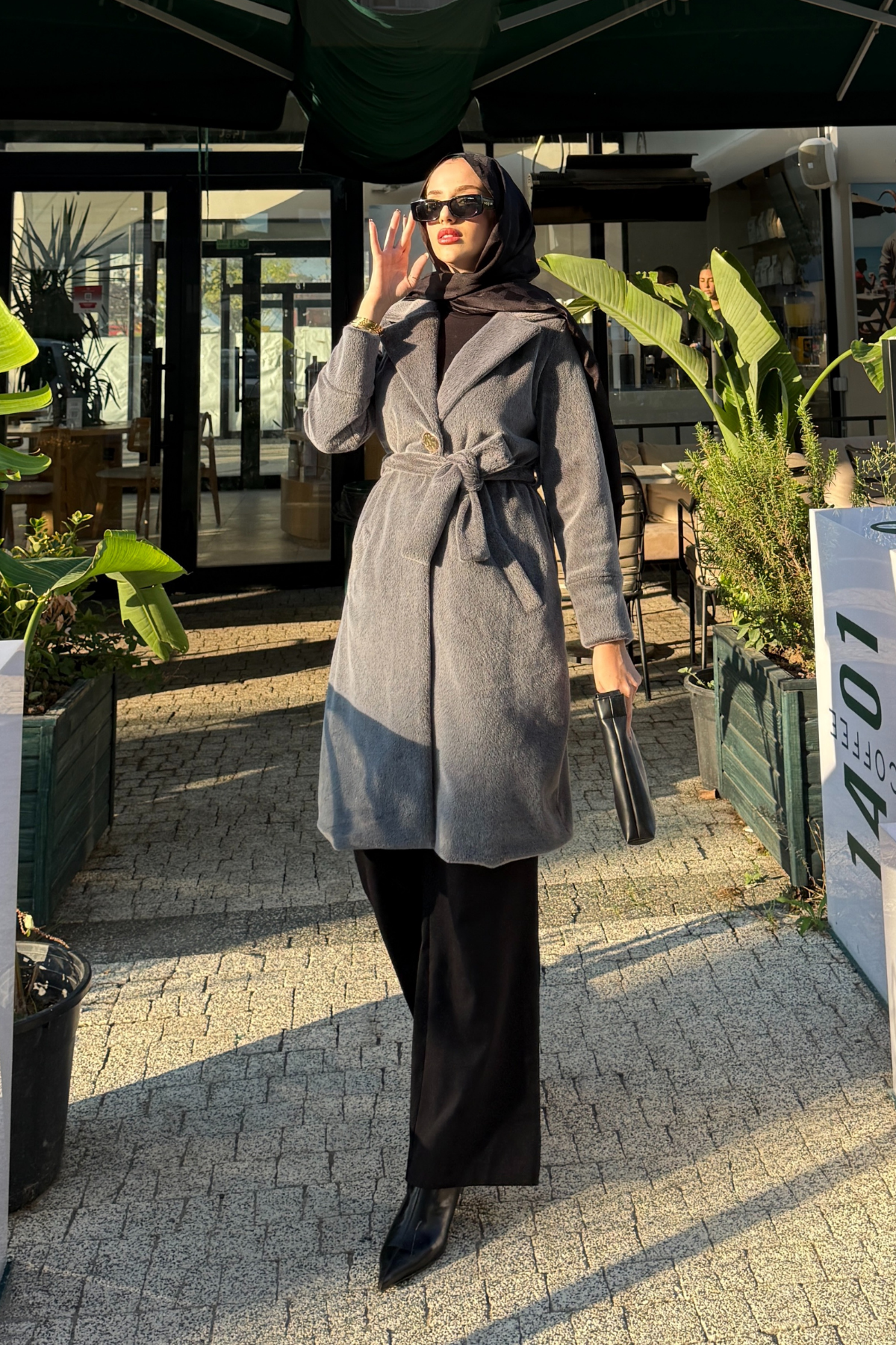 Düğme Detaylı Astarlı Angora Kaban- Füme (TD260)
