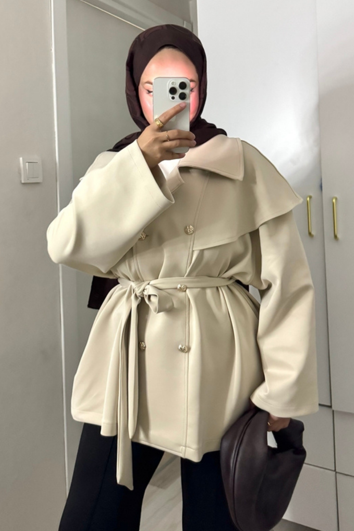 Düğme Detaylı Kuşaklı Oversize Scuba Ceket- Bej Standart (38-44 Uyumlu)