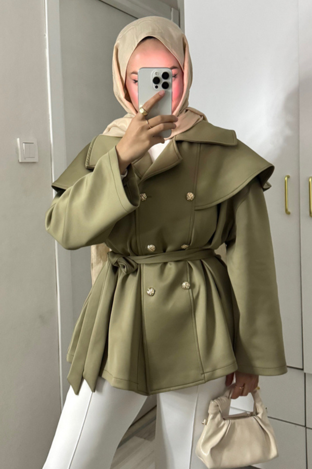 Düğme Detaylı Kuşaklı Oversize Scuba Ceket- Yağ Yeşili Standart (38-44 Uyumlu) (TD269)