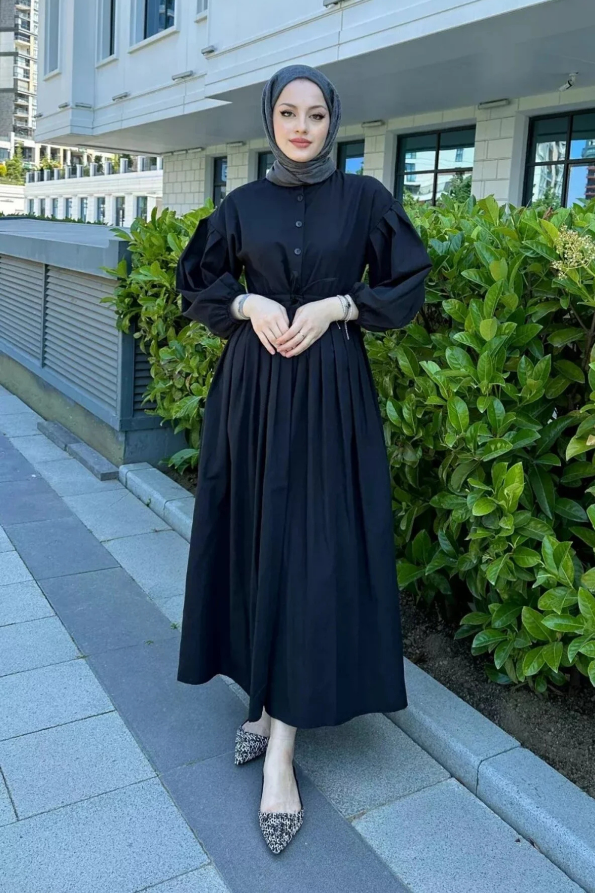 Düğmeli Beli Büzgülü Tesettür Elbise- Siyah (TD248)