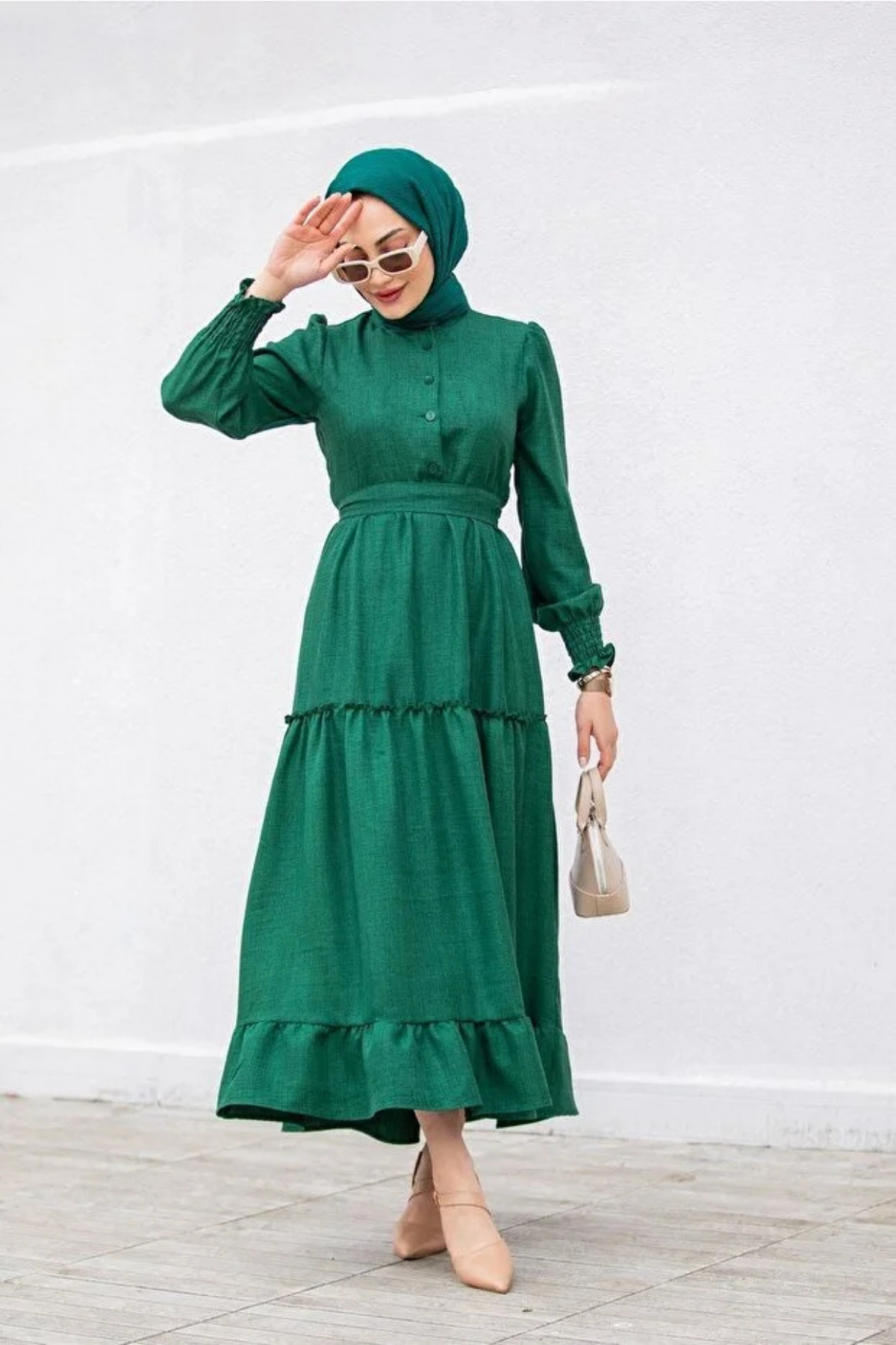 Eteği Fırfır Detaylı Keten Elbise- Zümrüt (TD235)