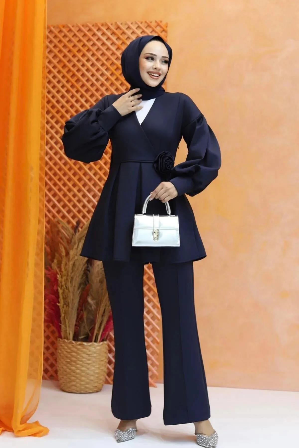 Gül Detaylı Balon Kol Tesettür Takım- Lacivert (TD250)