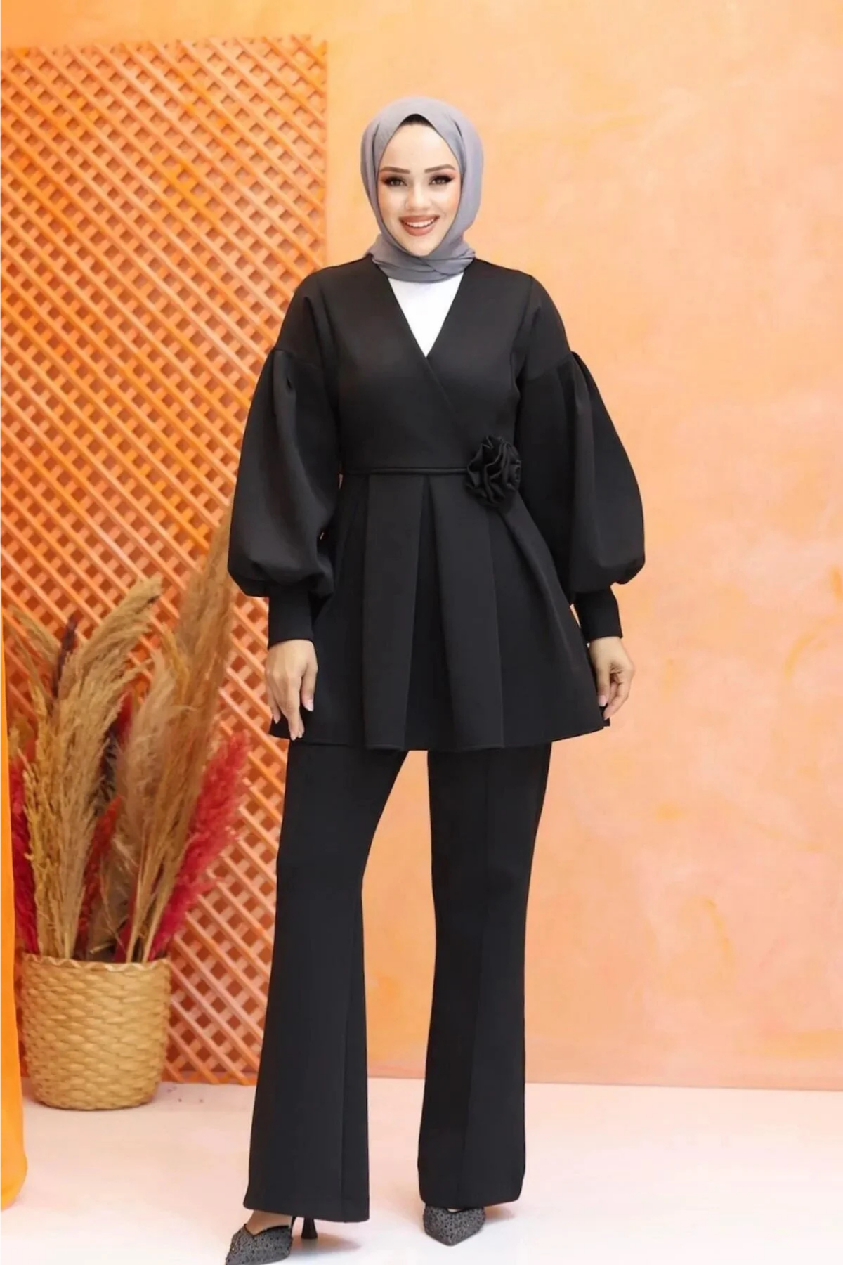 Gül Detaylı Balon Kol Tesettür Takım- Siyah (TD250)