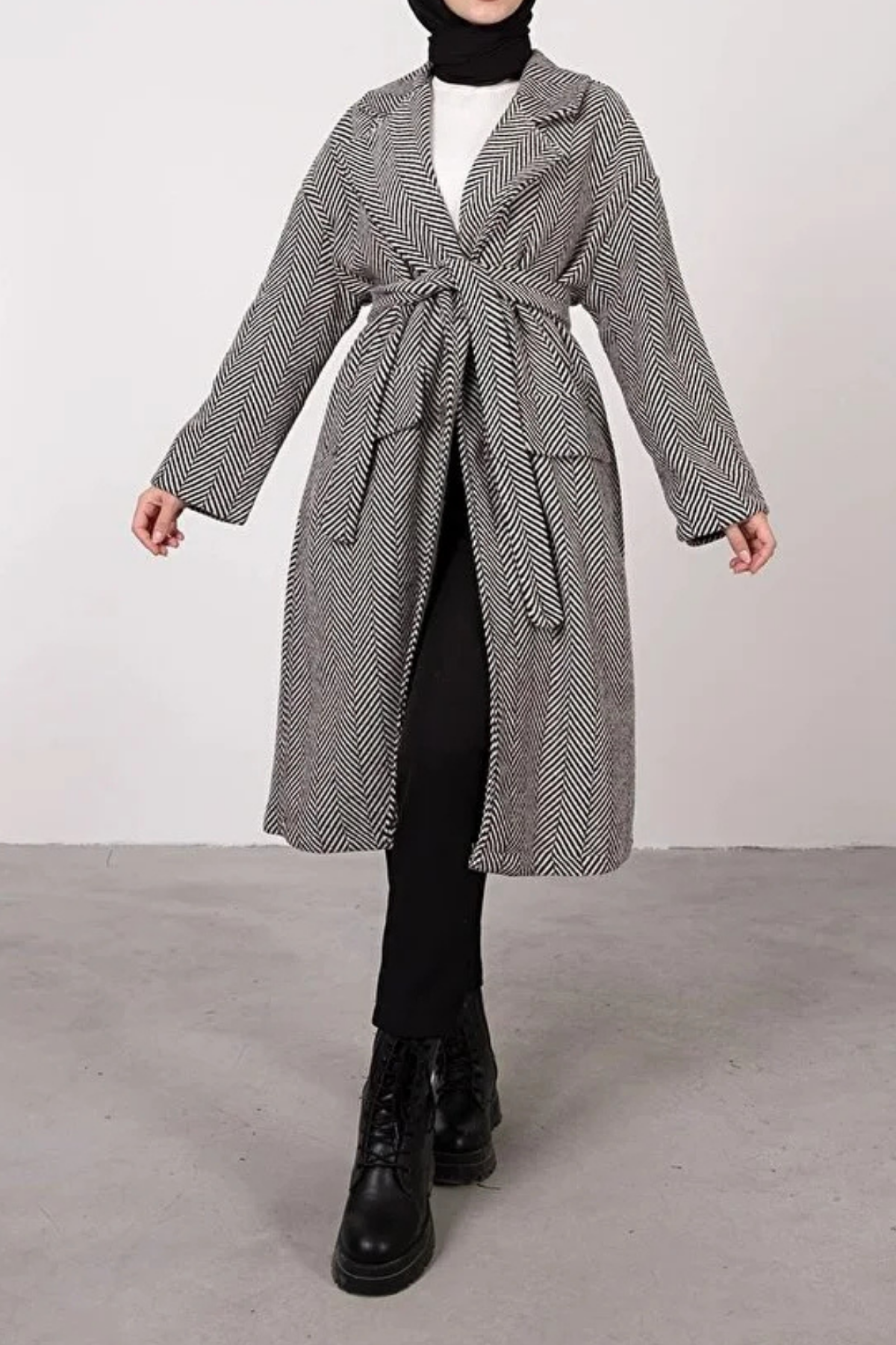 İnce Kılçık Çizgili Kruvaze Yaka Tesettür Kaşe Kaban- Standart Beden (36-42 Uyumludur)