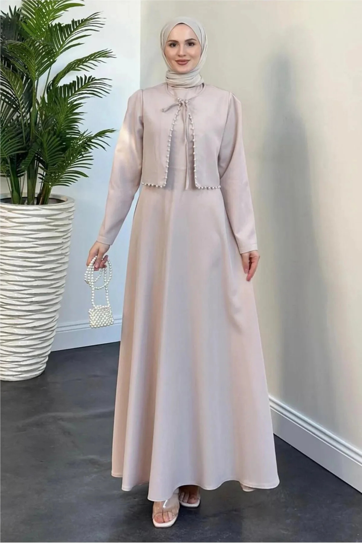 İnci Detaylı Elbiseli İkili Tesettür Takım- Pudra