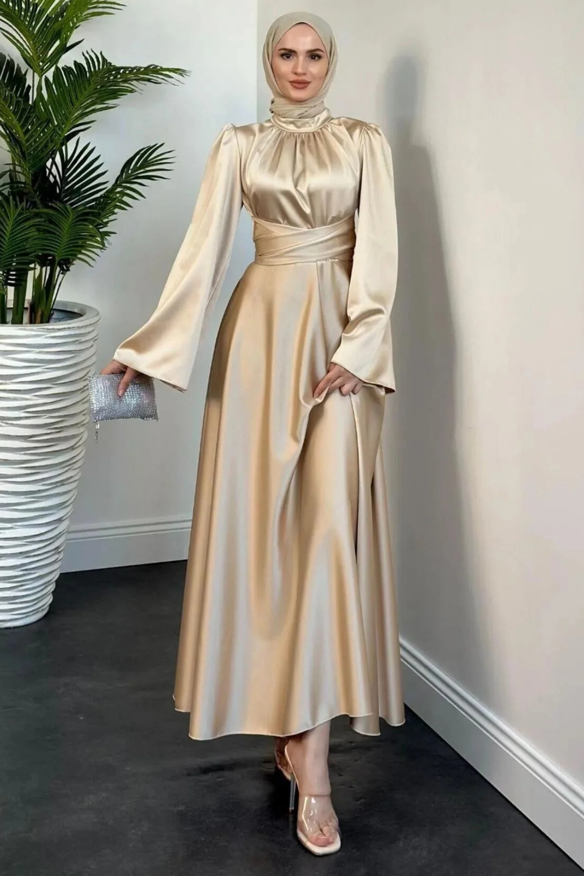 İspanyol Kol Belden Bağlamalı Saten Tesettür Abiye- Bej (TD223)