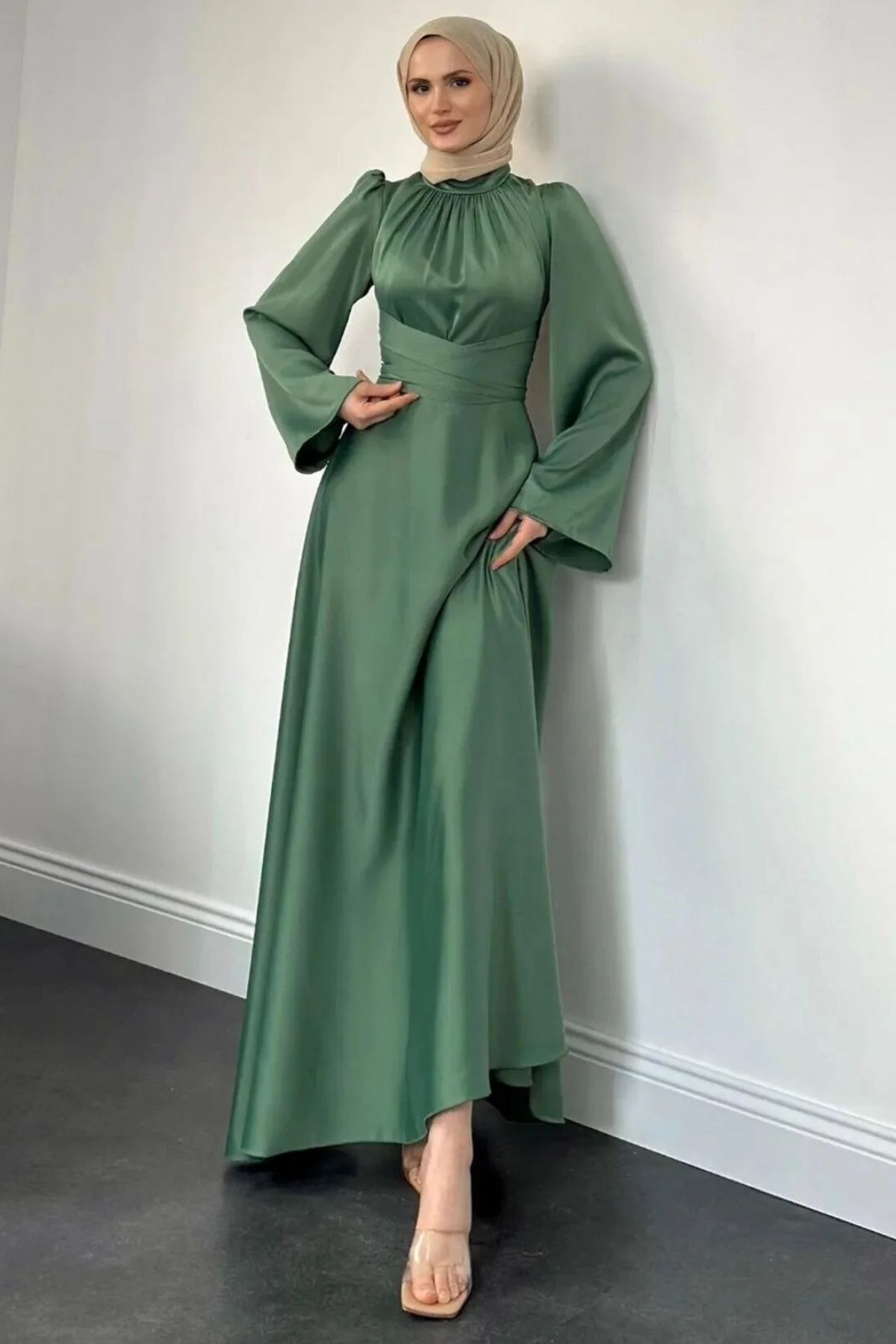 İspanyol Kol Belden Bağlamalı Saten Tesettür Abiye- Haki (TD223)