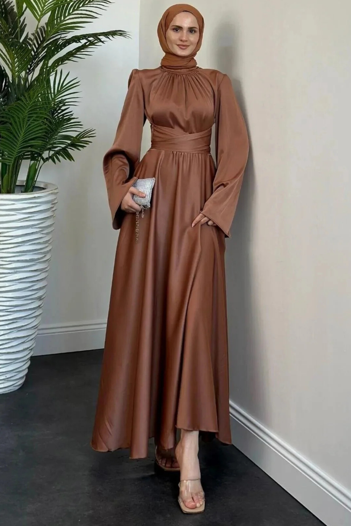 İspanyol Kol Belden Bağlamalı Saten Tesettür Abiye- Kahverengi
