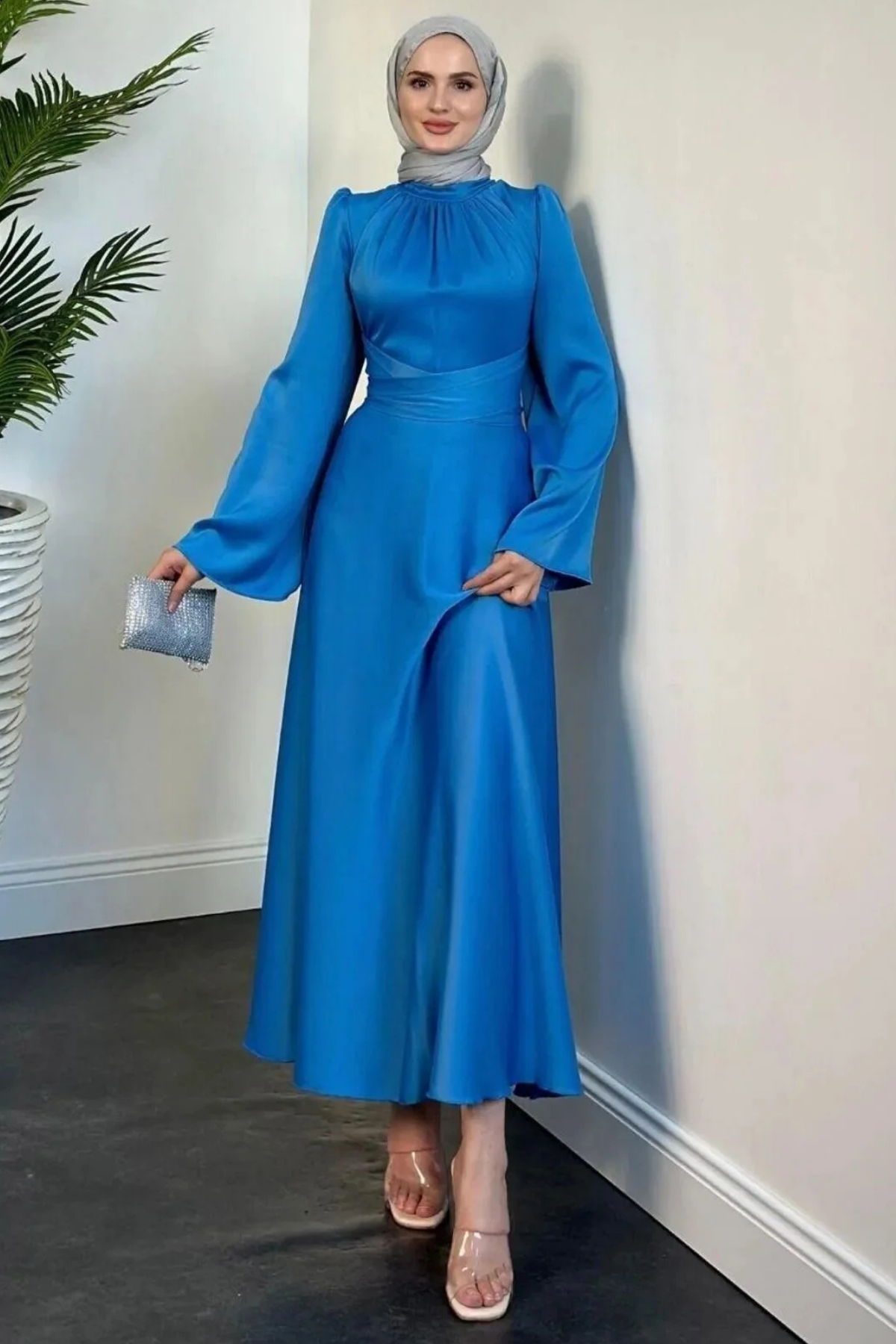 İspanyol Kol Belden Bağlamalı Saten Tesettür Abiye- Mavi