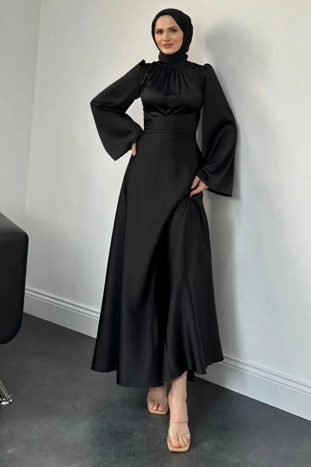 İspanyol Kol Belden Bağlamalı Saten Tesettür Abiye- Siyah