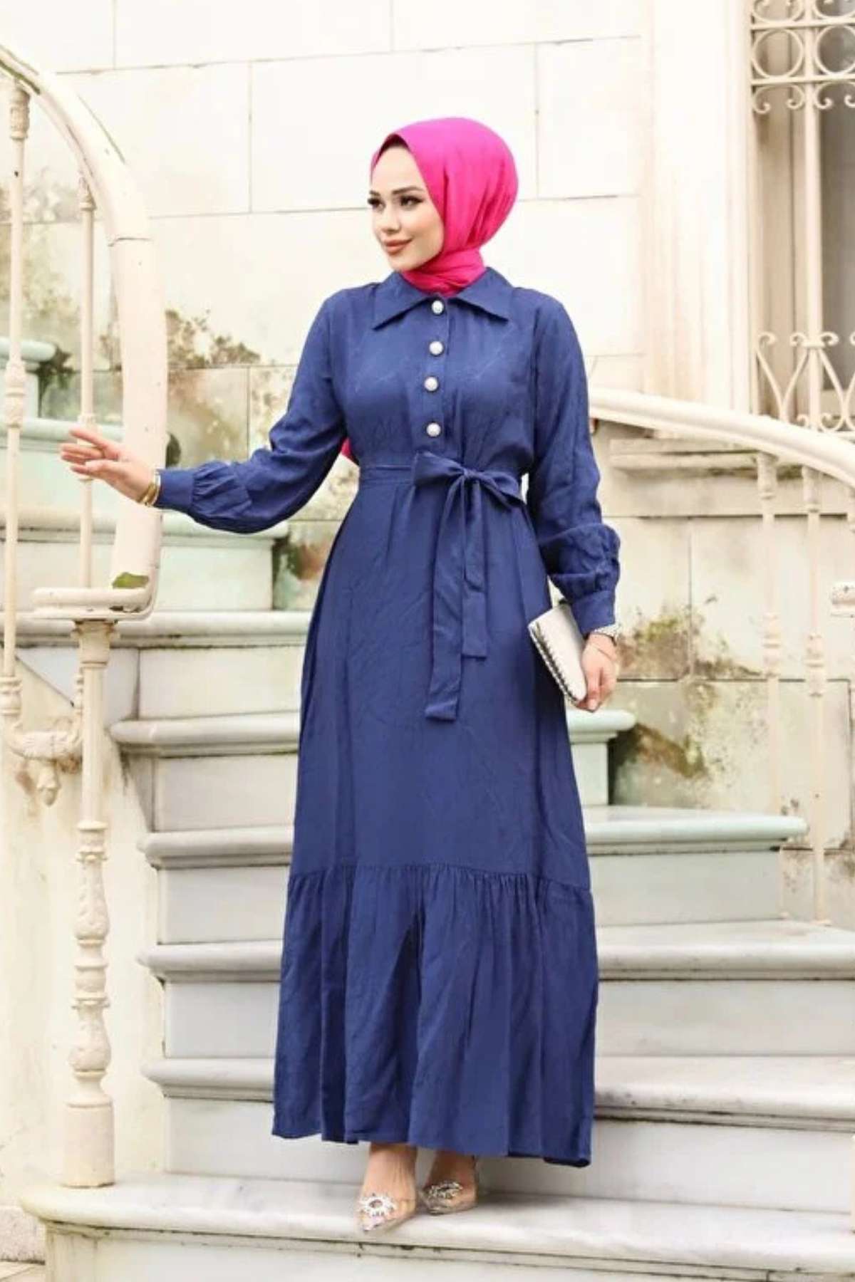 Jakarlı Gömlek Yaka Kuşaklı Tesettür Elbise- Lacivert (TD230)