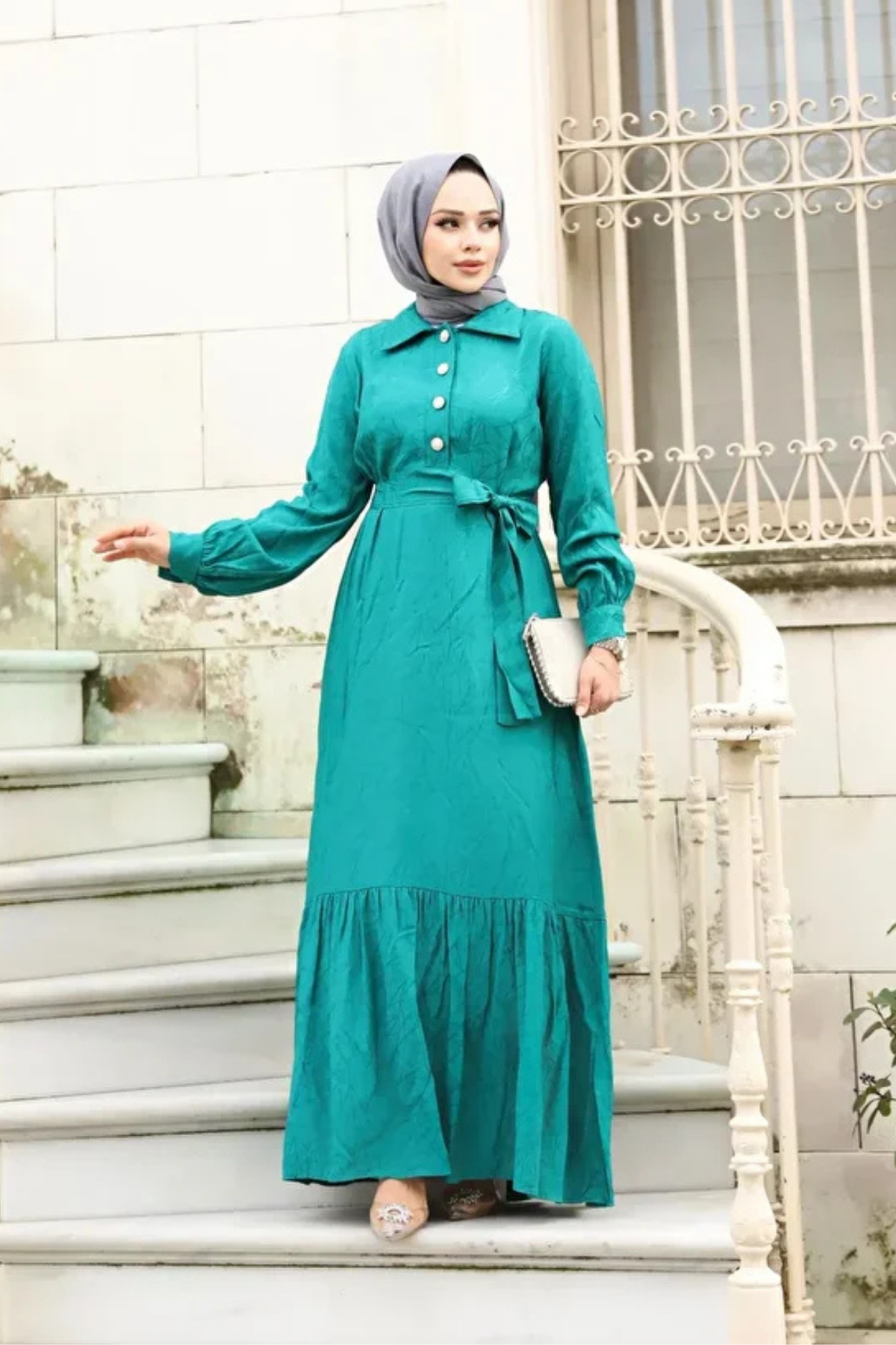 Jakarlı Gömlek Yaka Kuşaklı Tesettür Elbise- Turkuaz