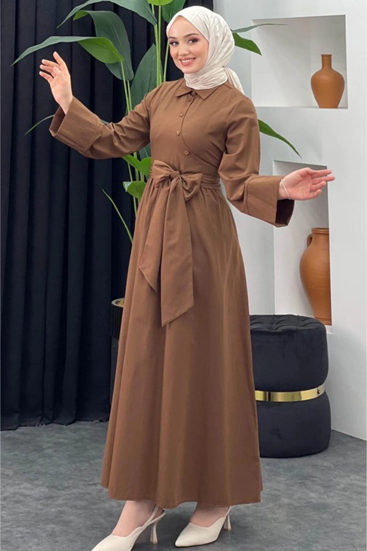 Kadın Bağlama Detaylı Gömlek Elbise- Kahverengi (TD279)